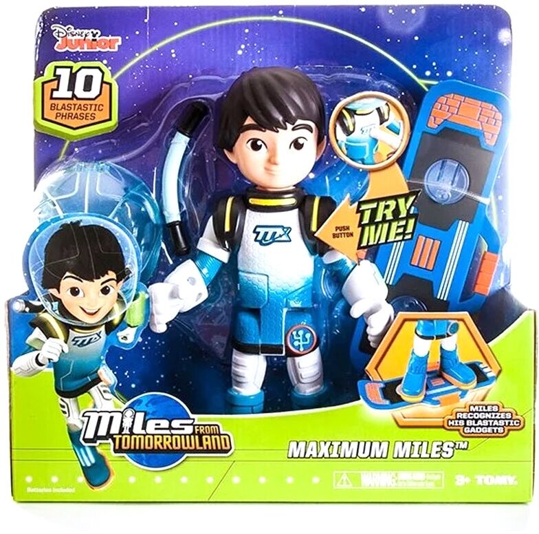 Были приятно удивлены качеством игрушки. Майлз большой 25 см, в комплект входят: шлем, скейт космический, орудие, все яркое, красивое, приятное на ощупь. Он на батарейках, говорит на английском языке фразы из мультика, кнопка на руке, на груди и на ботинке. Ребенок в восторге. К нему в комплект покупали питомца страуса и мини фигурку девочки в шлеме. Рекомендую, для мальчика будет прекрасным подарком!!!
