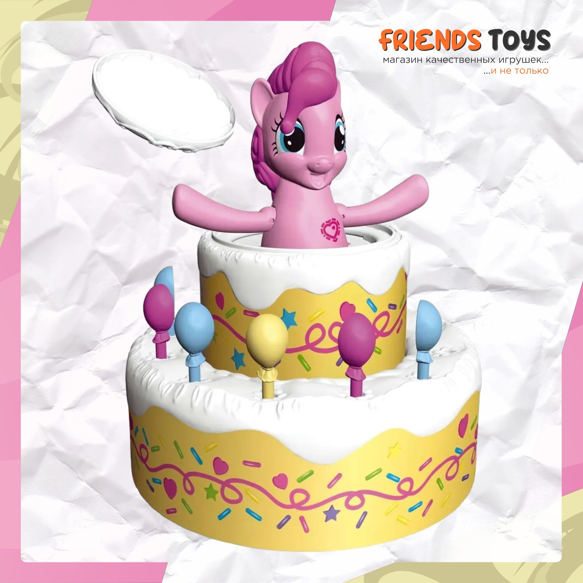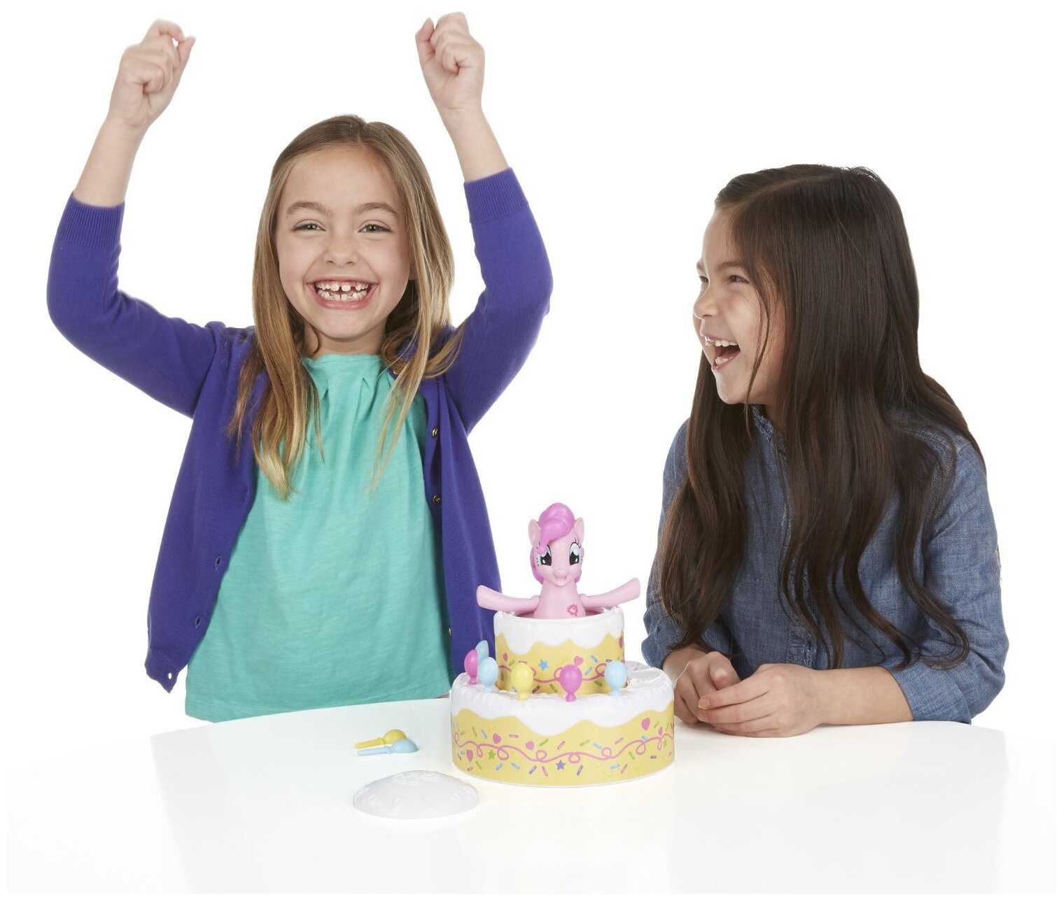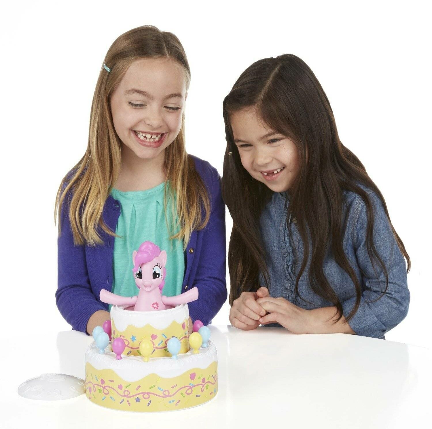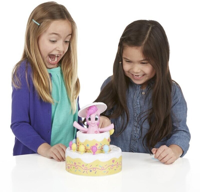В комплект входит множество аксессуаров для украшения праздничного торта. Этот торт - основная часть игры. Он очень красивый, его будет весело украшать яркими воздушными шарами, которые одновременно являются ложечками. Внутрь торта помещается фигурка Пинки Пай. Чем больше украшений вы ставите на торт, тем веселее становится Пинки Пай - в какой-то момент она выпрыгивает, удивляя и радуя игроков.