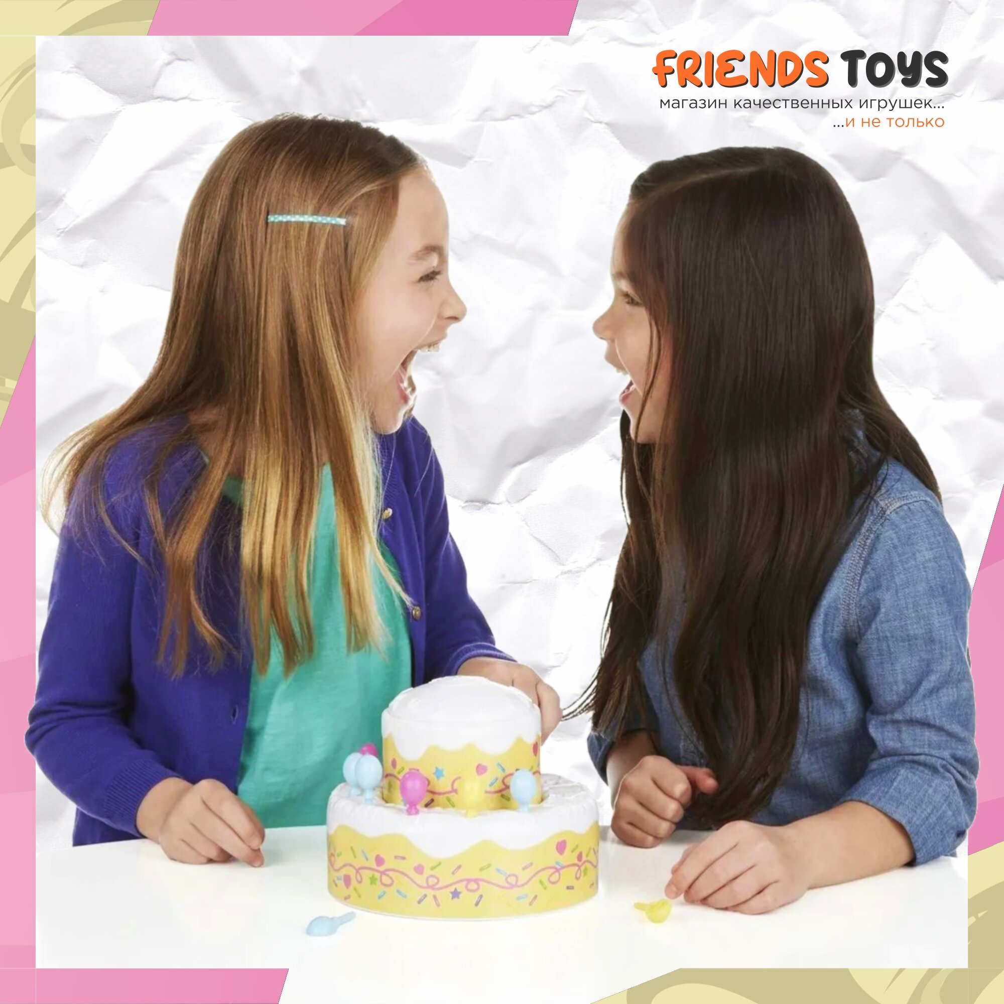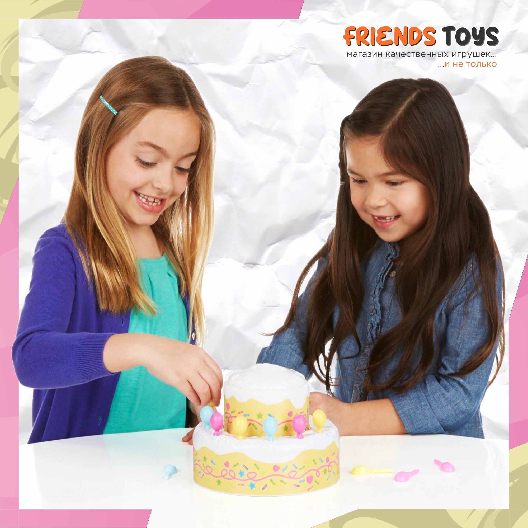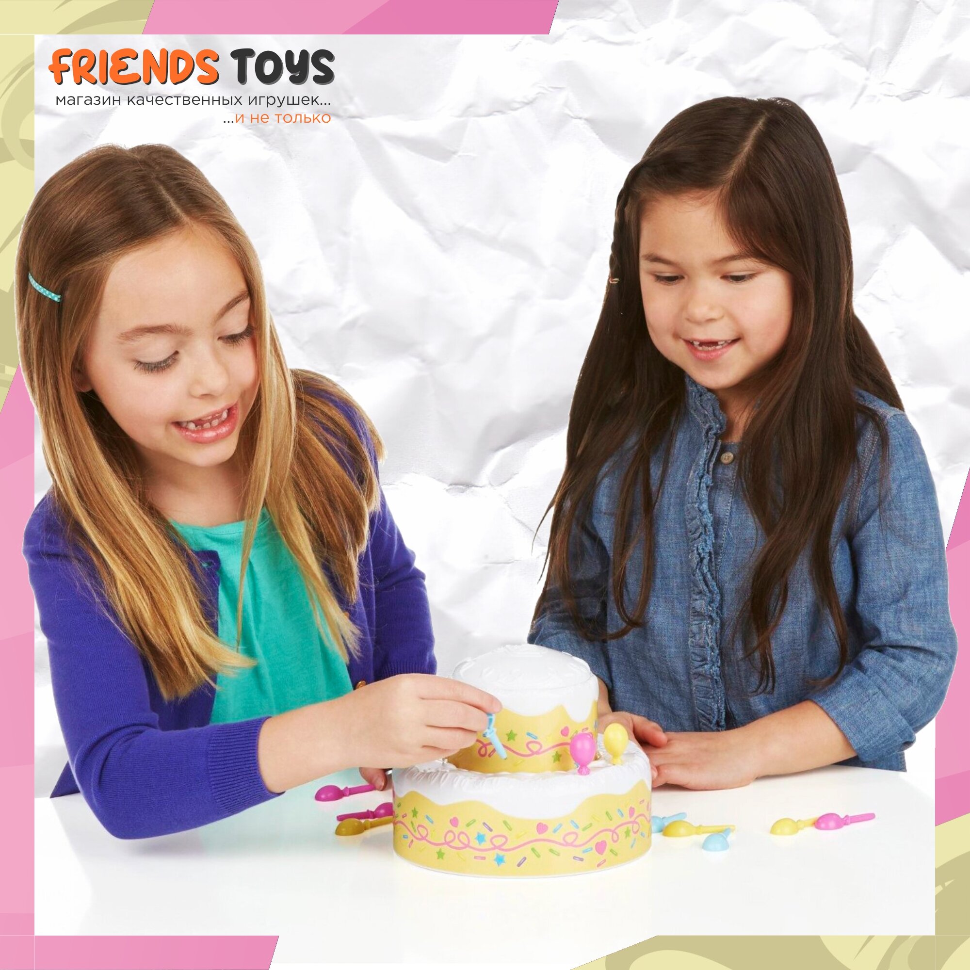 В комплект входит множество аксессуаров для украшения праздничного торта. Этот торт - основная часть игры. Он очень красивый, его будет весело украшать яркими воздушными шарами, которые одновременно являются ложечками. Внутрь торта помещается фигурка Пинки Пай. Чем больше украшений вы ставите на торт, тем веселее становится Пинки Пай - в какой-то момент она выпрыгивает, удивляя и радуя игроков.