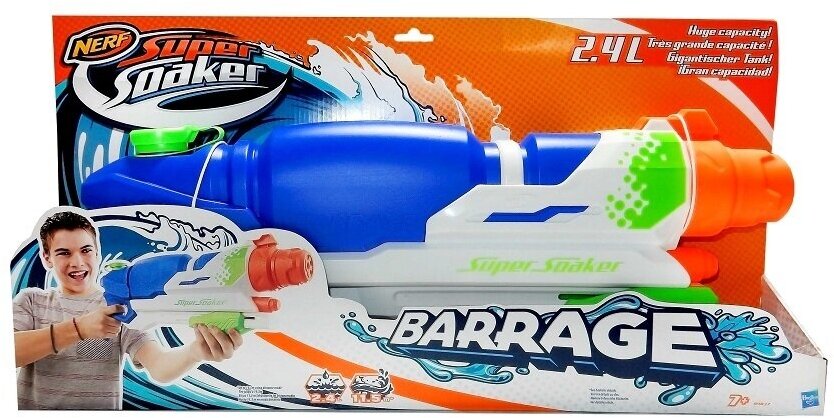 Супер Сокер Шквал - уникальный бластер серии Nerf, стреляющий водой, от производителя Hasbro. Он выполнен из прочного и в то же время легкого пластика высокого качества в синем, белом, зеленом и оранжевом цветах. Резервуар для воды плотно закрывается на крышку, что не позволяет воде вытекать и отвлекаться во время перестрелки. Ребенок может перестреливаться с друзьями, или же просто самостоятельно тренировать меткость выстрела. Предусмотрено 3 режима стрельбы: вы можете самостоятельно отрегулировать мощность струи - вы сможете буквально окатить соперника с ног до головы! Море смеха, эмоций и впечатлений от игры гарантировано! Игрушка предназначена для детей от 7 лет.