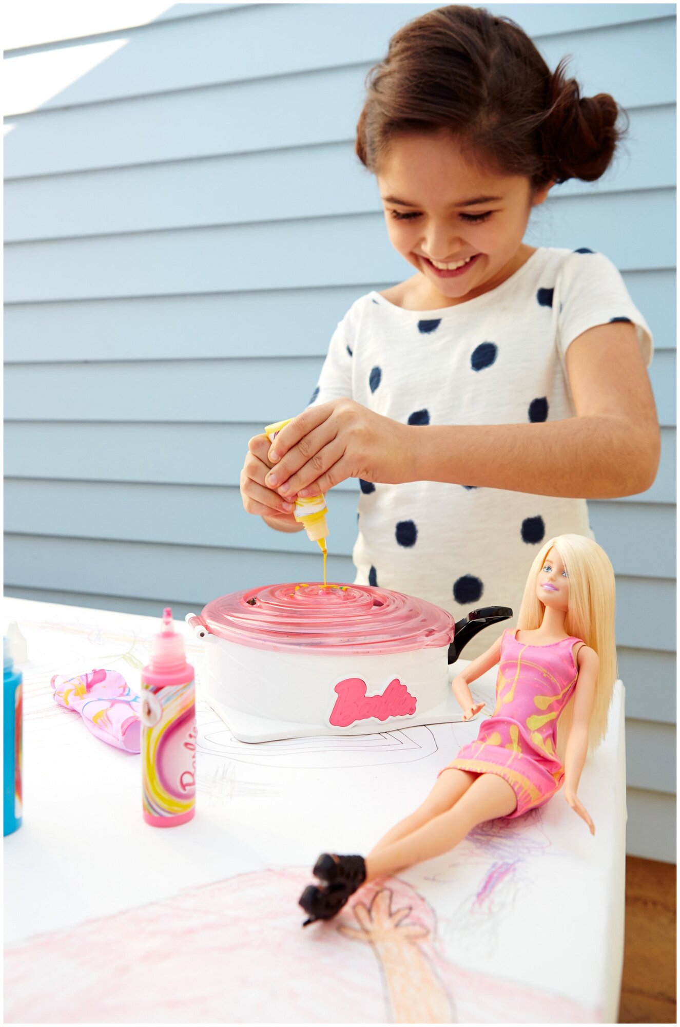 Уникальная игрушка от компании Mattel - набор для создания цветных нарядов. В комплект входят красавица-блондинка кукла Барби, специальное приспособление для декорирования нарядов (работает по принципу центрифуги), краски для текстиля 3 цветов, а также 3 дополнительных платья. Девочке предстоит почувствовать себя самым настоящим дизайнером и собственными руками создать настоящий шедевр - эксклюзивное платье для куклы с уникальным рисунком!