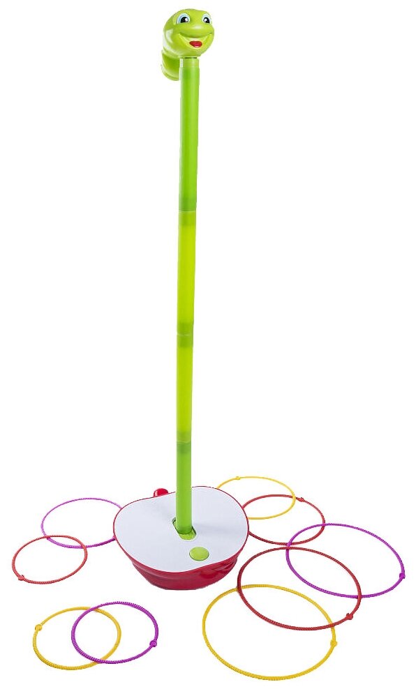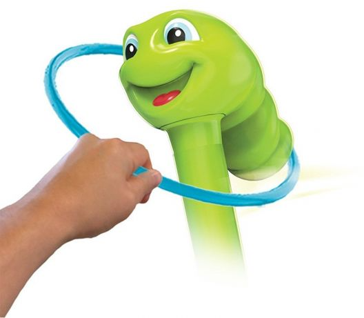 Перед вами весёлая игра от компании Spin Master – Танцующий червячок. Игра представляет собой червя, закрепленного на подставке в виде качающейся половинки яблока: словно червячок выглядывает из яблочка. Червь качается и вращается, а задача игроков - забросить на него обручи.