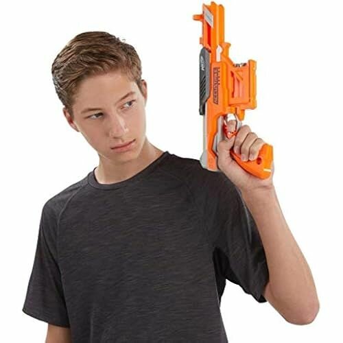 У оружия Нерф Бластер очень хорошо проработана конструкция. Данная модель обладает легким корпусом оранжевого цвета с серыми и белыми элементами, который удобно держать в руках, и плавным спусковым курком. Мягкие безопасные стрелы благодаря специальному наконечнику летают более точно, далеко и при этом не ранят.