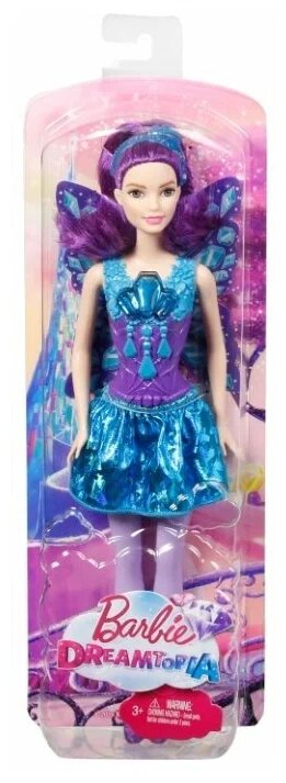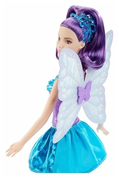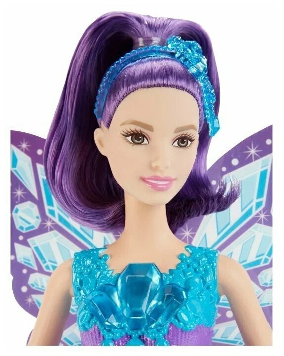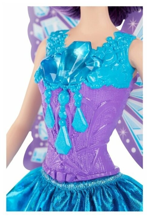 Кукла-фея серии Gem Fashion выглядит очень ярко и эффектно: у нее фиолетовые волосы, собранные в элегантную прическу и убранные под голубой ободок, а за ее спиной мы видим волшебные, переливающиеся крылья. У Барби очень стильный, оригинальный наряд: верх платья выполнен из пластика. а юбка - из перламутрового текстиля. На ногах красавицы - изящные туфельки на небольшом каблуке.