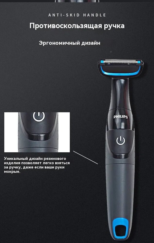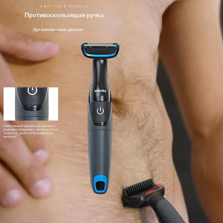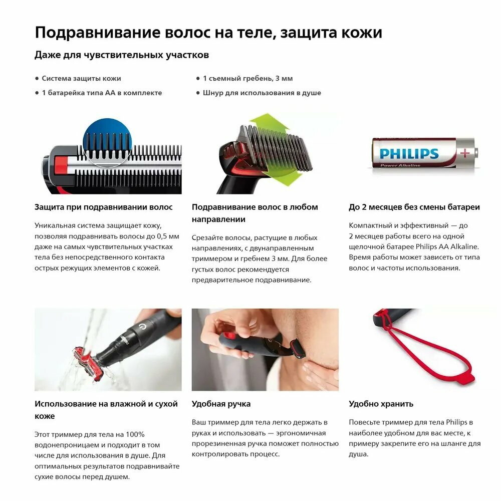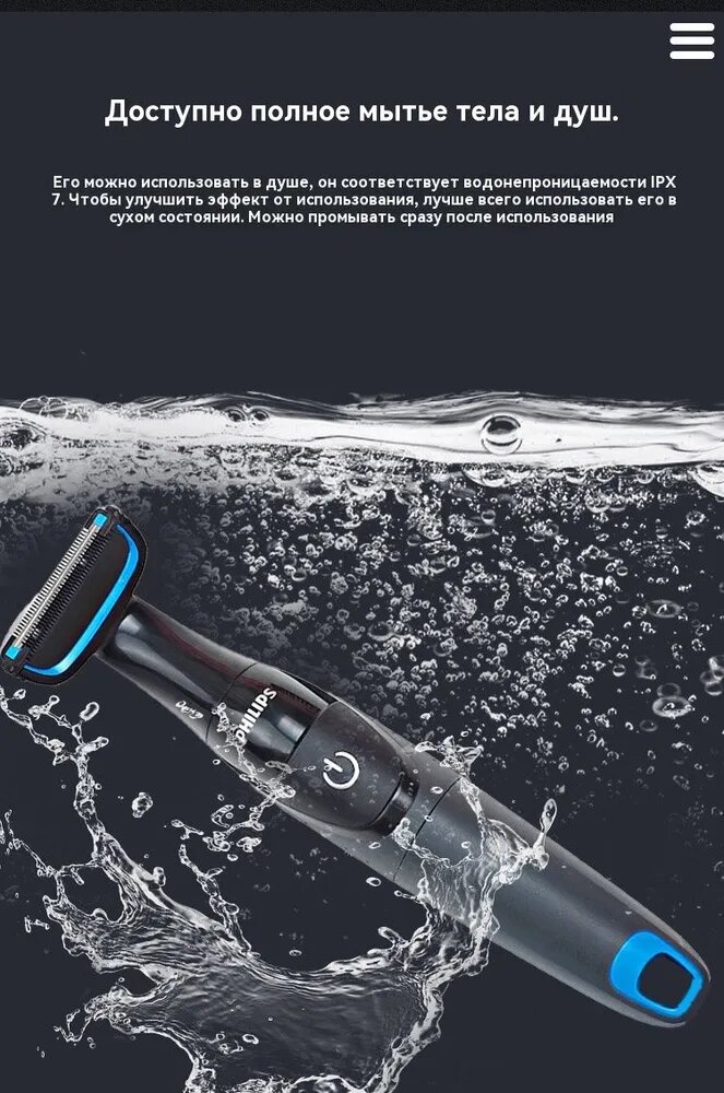 Комфортное и гладкое бритье как на сухой, так и на влажной коже. Триммер для тела Philips на 100 % водонепроницаем, поэтому по завершении процедуры его можно просто промыть водой.