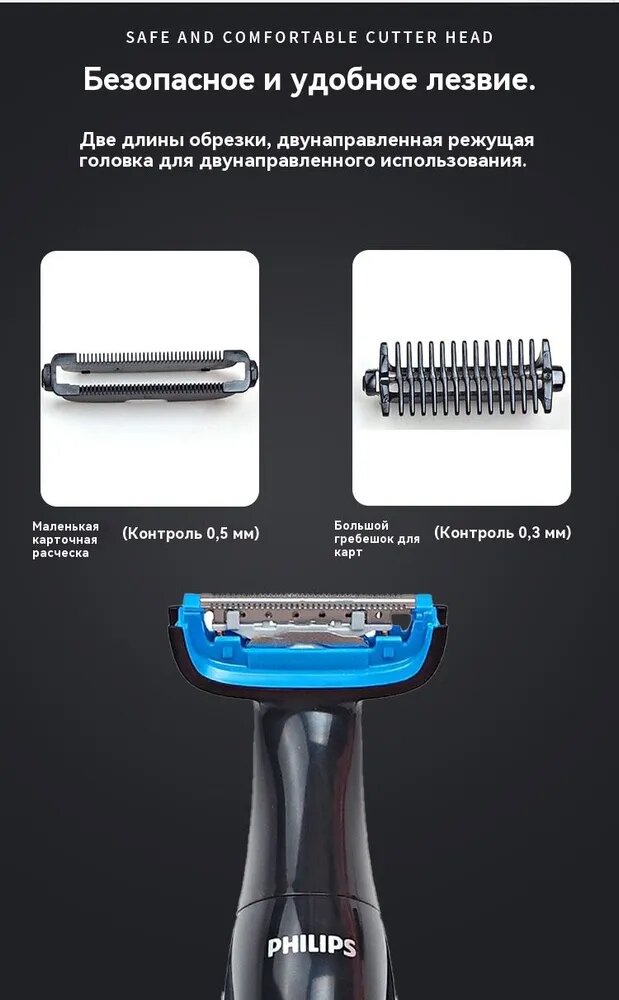 Уникальная система защищает даже самые чувствительные участки тела, позволяя подравнивать волосы до 0,5 мм без непосредственного контакта лезвий с кожей.