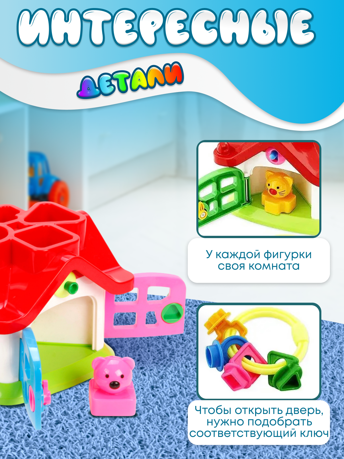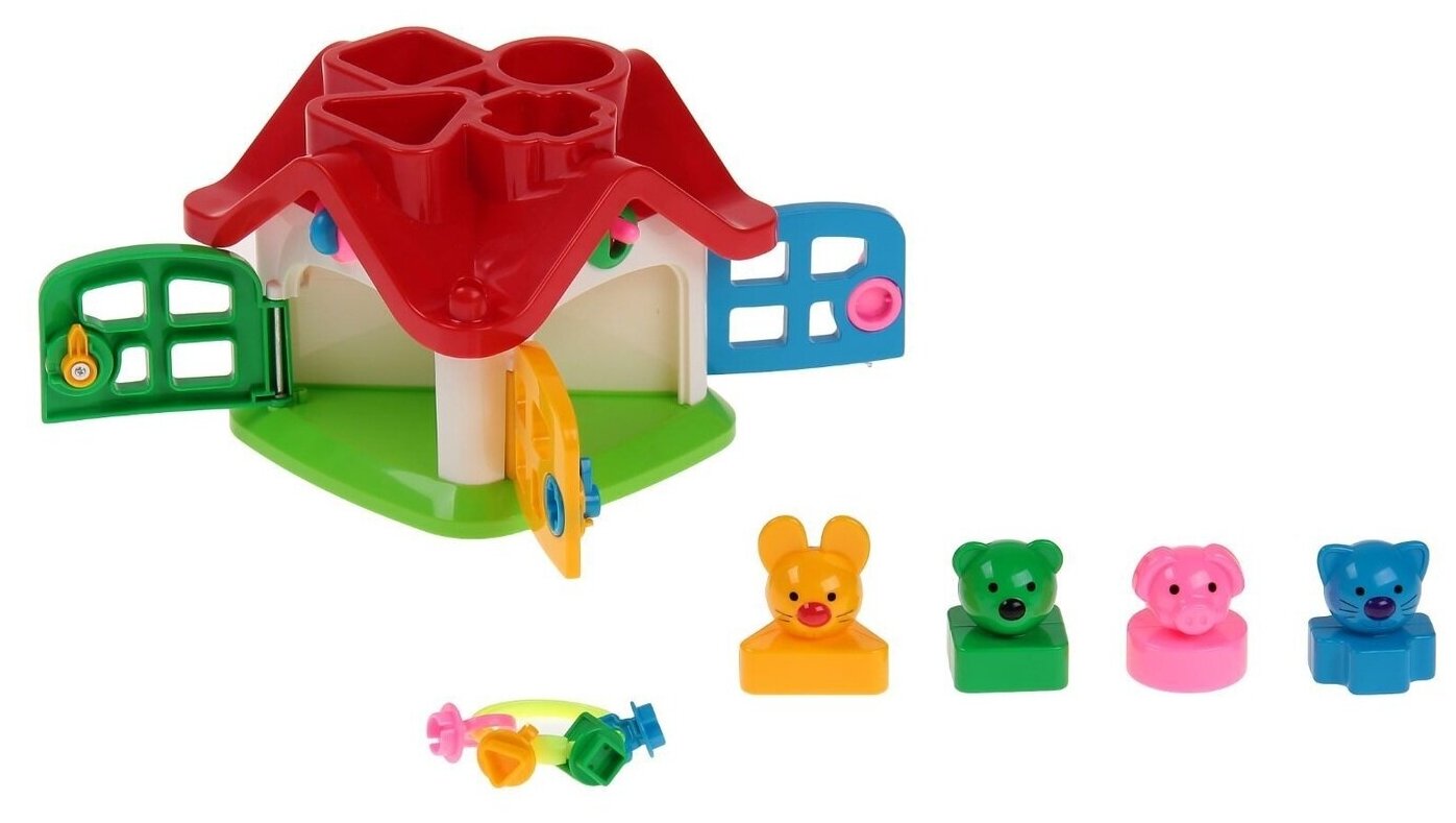 Логический теремок от известного производителя игрушек Полесье обязательно понравится детям. Это не просто красочный теремок, это еще и сортировщик. Теремок имеет 4 отверстия в крыше в виде простых геометрических фигур. В процессе игры ребенку необходимо подобрать по форме нужную деталь и вставить ее в теремок. Чтобы достать фигурки, необходимо подобрать нужный ключик и открыть двери теремка. Игрушка окрашена в яркие радужные цвета и дополнена забавными фигурками животных на деталях для сортировки.