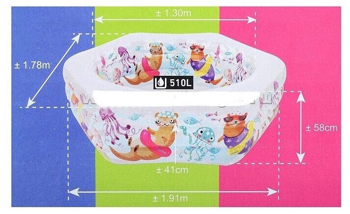 Intex Бассейн Риф 191х178х61 см Яркий бассейн необычной шестиугольной формы выглядит, словно маленькая модель океана. На внешних стенках изображены разнообразные подводные жители: рыбки, осьминоги и даже морские коньки. Противоскользящее покрытие надувного дна убережет вас от падений и травм. В бассейне с комфортом могут разместиться сразу несколько детей и даже взрослых. Сделан бассейн из тончайшего, но очень прочного винила и состоит из трех независимых камер, которые имеют двойные клапаны. Размер: 191х178х61 см. Вместимость бассейна: 723 л. (при 80% наполнении) Вес: 4.4 кг.