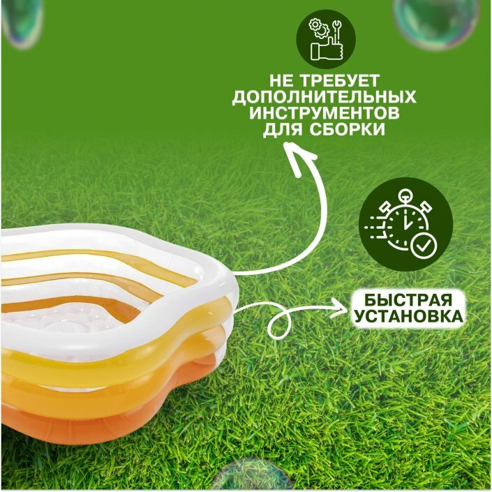 Этот небольшой бассейн станет настоящей звездой Вашего загородного дома или участка. Яркая расцветка будет постоянно радовать глаз, а чистая прохладная водичка нежно ласкать нагревшуюся за день кожу. Отличительная особенность данной модели – надувной пол – делает его более комфортным в применении. Стенки бассейна - полупрозрачны, поверхность дна имеет противоскользящее покрытие. Надувное дно оборудовано отдельным клапаном для накачивания и удобным клапаном для быстрого слива воды.