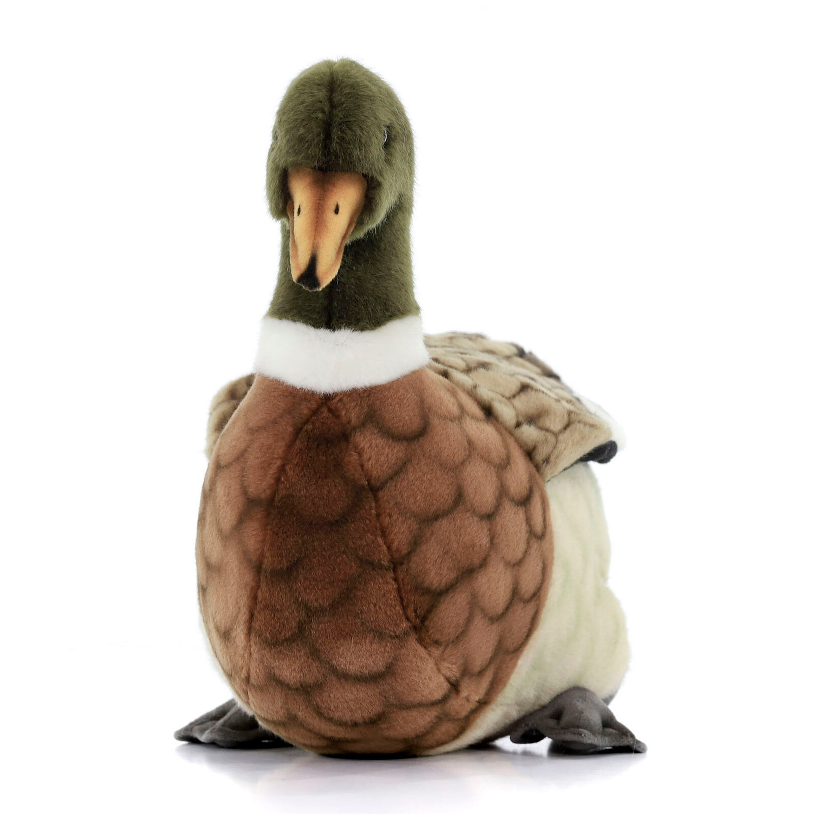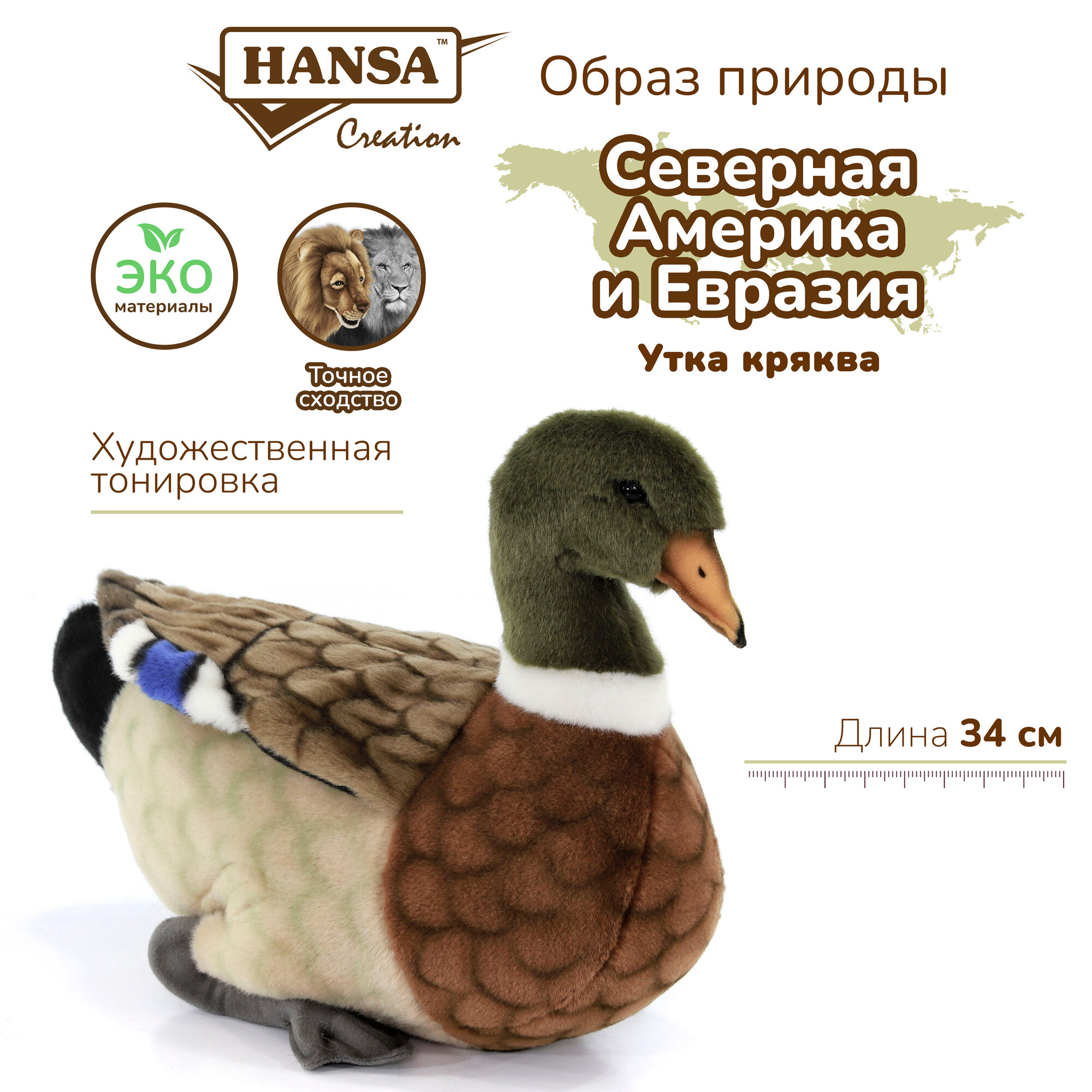 Утка-кряква, 34 см. Игрушки Ханса изготовлены из искусственного меха очень приятного на ощупь, внутри имеют титановый каркас. Наличие каркаса позволяет изменять положение лап и туловища, а также поворачивать голову. Игрушки полностью копируют оригинал и могут быть выполнены в натуральную величину. На крупно габаритных игрушках ослик, лошадка и проч., размером от 1м можно сидеть верхом. Благодаря прочному каркасу, они выдерживают вес до 65-70кг.