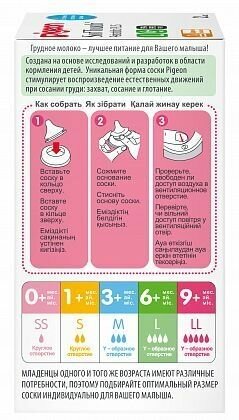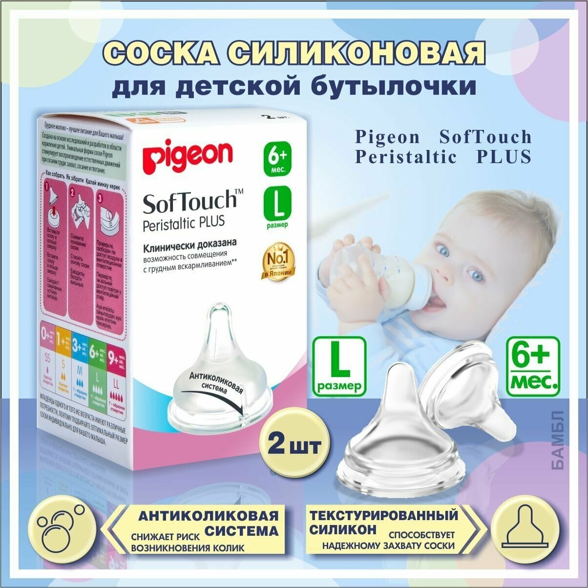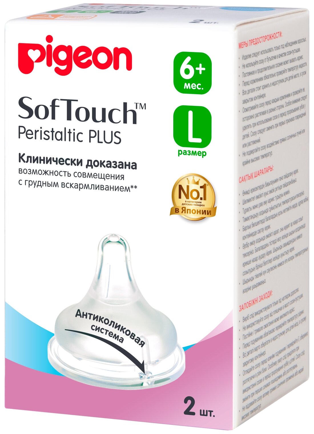 Соска Pigeon для бутылочки с широким горлом с 6 мес. 2 шт. (размер L) Соска Pigeon Peristaltic PLUS гораздо шире по сравнению со стандартными аналогами, а ее кончик мягче и имеет более закругленную форму. Благодаря уникальной форме соски стало возможным сделать процесс кормления более естественным. Соска идеально сочетается с сосательной ямкой в полости рта малыша и обеспечивает стимуляцию естественных перистальтических движений языка младенца.