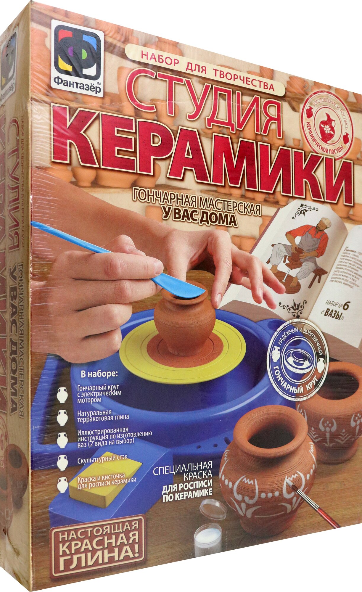 | Состав набора | кисть, гончарный круг с электрическим мотором, скульптурный стек, натуральная терракотовая глина, специальная белая краска для росписи по керамике, руководство по изготовлению керамики |