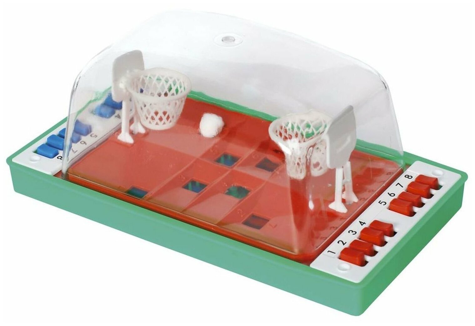 Настольная игра баскетбол - любимая всеми детьми советского времени, понравится и современным малышам. Игра баскетбол не требует специальной подготовки, достаточно ударить по клавишам игры, чтобы мяч попал в корзину соперника. От силы удара по клавишам зависит высота полета мяча. Цель игры: - как и в настоящем баскетболе - забросить как можно больше мячей в баскетбольную корзину противника.