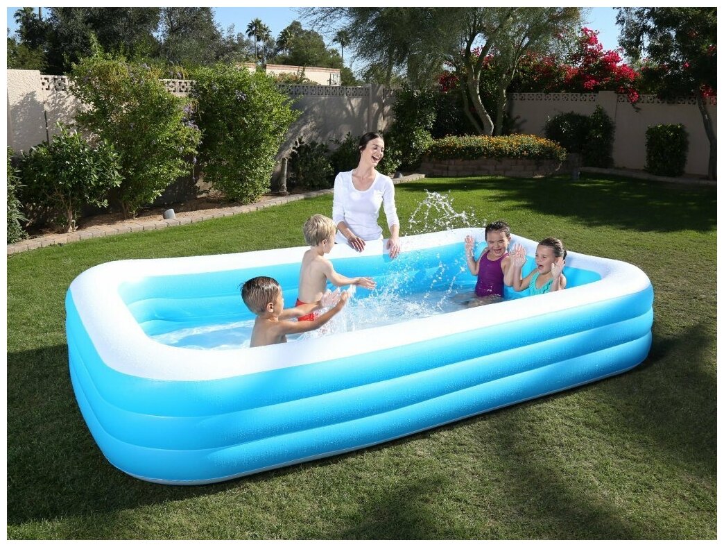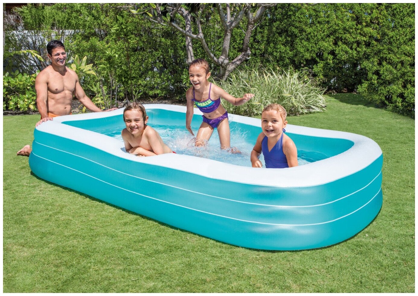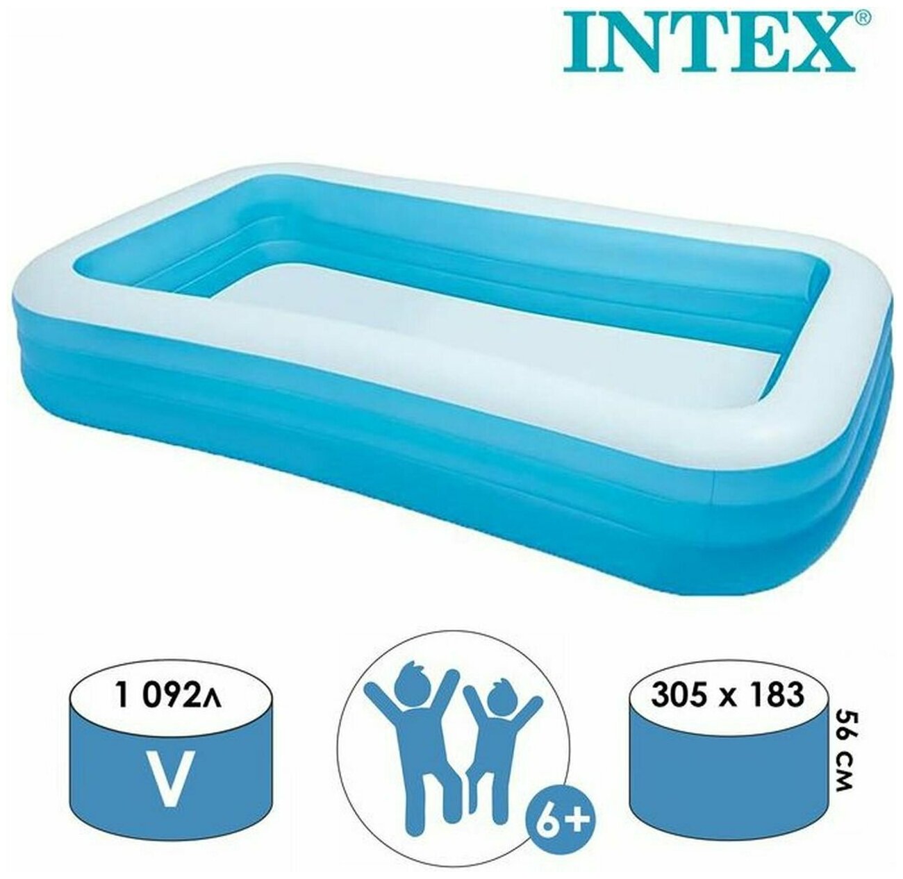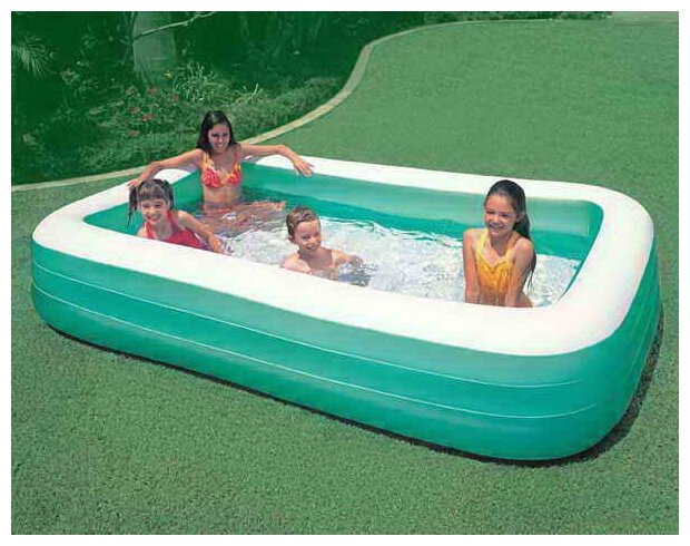 Надувные бассейны для детей серии «Интекс» - это всегда высокое качество в сочетании с приемлемой ценой! Семейный бассейн голубого цвета размером 183 на 305 на 56 сантиметров может стать замечательным украшением любого загородного дома или дачи. Этот прямоугольный бассейн рассчитан на нахождение в нем от двух до четырех человек, поэтому подходит для коллективного и семейного отдыха на свежем воздухе.