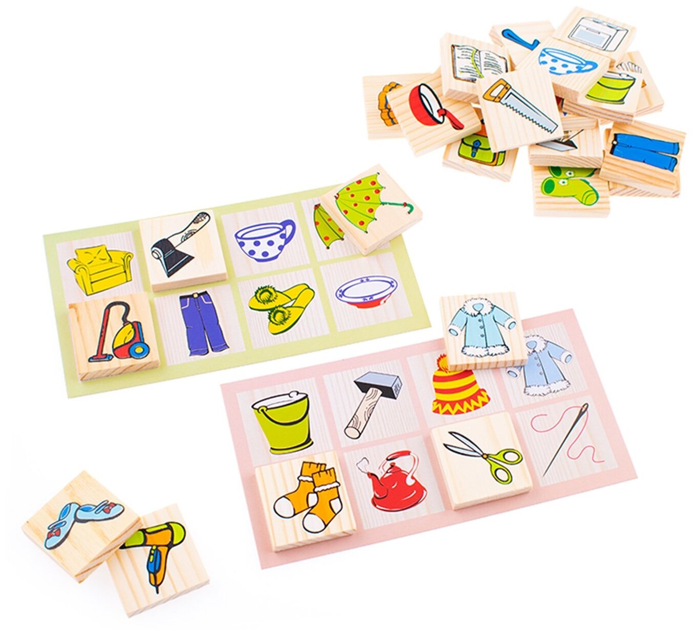 Расстроена из-за отсутствия карточки. Фишки из необработанного дерева. У нас есть лото разных фирм, не могу сказать, что это особенно лучше или хуже других. Но как уже написала, картинки приятные и нужные.