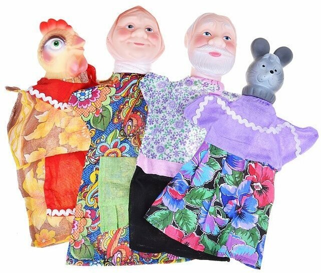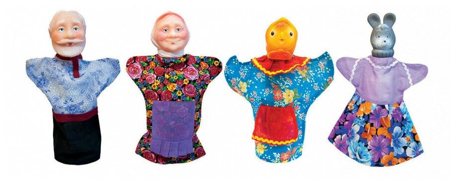Русский стиль Кукольный театр Курочка Ряба 4 персонажа с помощью которого ребенок познакомится с русской народной сказкой. Вместе с родителями дети смогут разыгрывать спектакль, овладев искусством перевоплощения. Декорации можно изготовить самим, проявив фантазию и изобретательность. Такой кукольный театр предусматривает участие нескольких детей. Таким образом ребенок научится находить себе друзей, станет общительней и дружелюбней.Куклы-перчатки подходят для любого размера руки: для руки родителя и для детской ручки. В комплект входят: Куклы-перчатки – 4 шт. (дед, бабка, курочка, мышка) Сценарий сказки