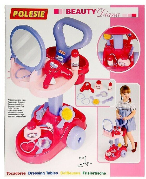 Туалетный столик с зеркальцем и набором аксессуаров и украшений для сюжетно-ролевых игр маленьких красавиц. Девочка с удовольствием будет создавать разнообразные модные прически любимой кукле, себе и подругам, а также сможет украсить свой туалетный столик в своем собственном оригинальном стиле! Набор «Салон красоты „Диана“ создан специально маленьких модниц и принцесс. Каждая девочка с детства стремится к красоте и так хочет быть похожей на свою маму, у которой есть целый арсенал косметики и аксессуаров. Все предметы, входящие в набор, компактно располагаются на тележке, которую малышка сможет перевозить в удобное для нее место. Маленькая принцесса сможет открыть свой собственный салон красоты и пригласить в него подружек. С этим набором Ваша принцесса почувствует себя настоящим мастером салона красоты.