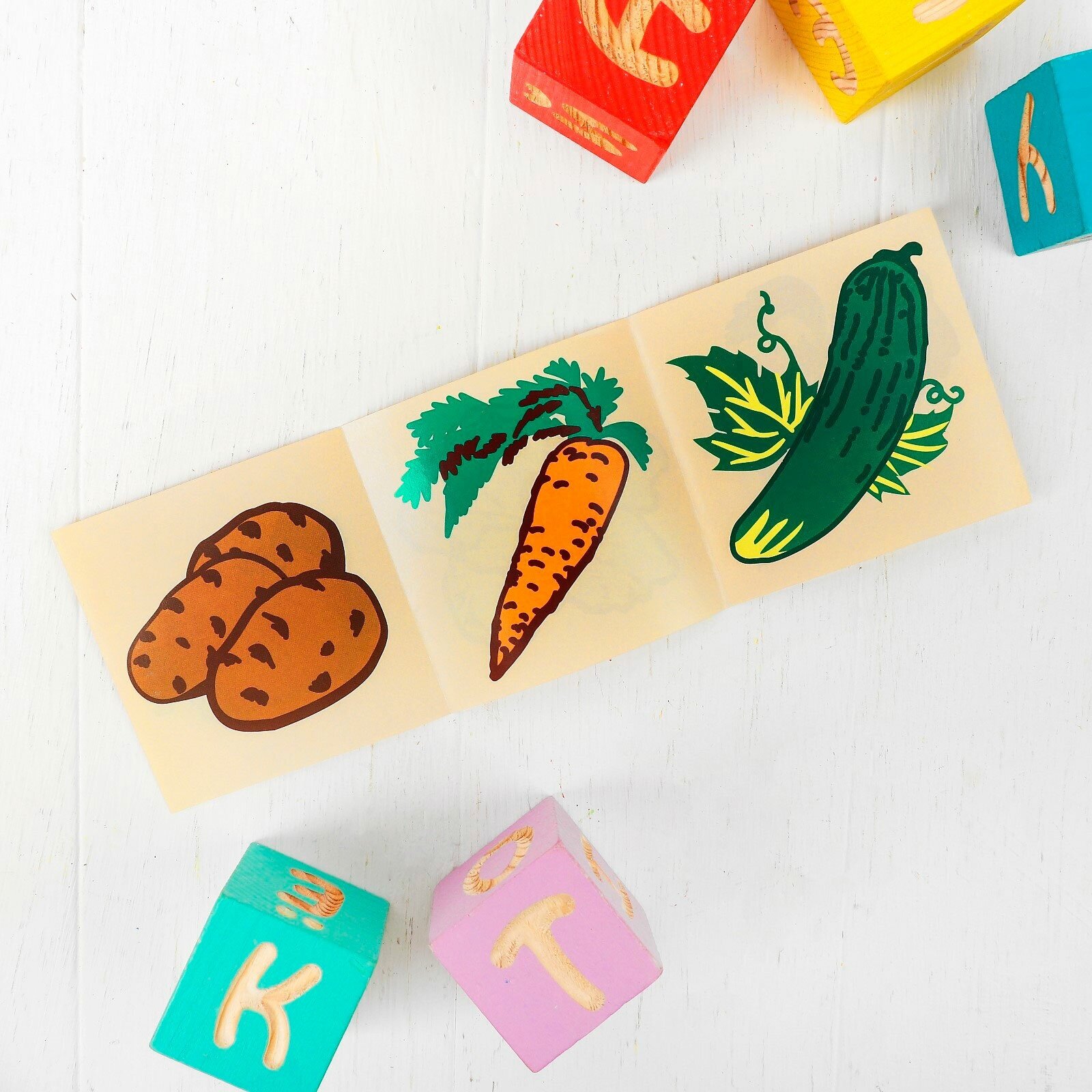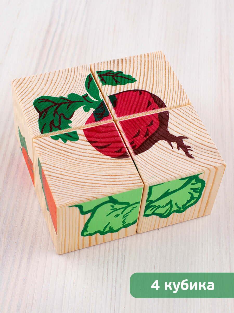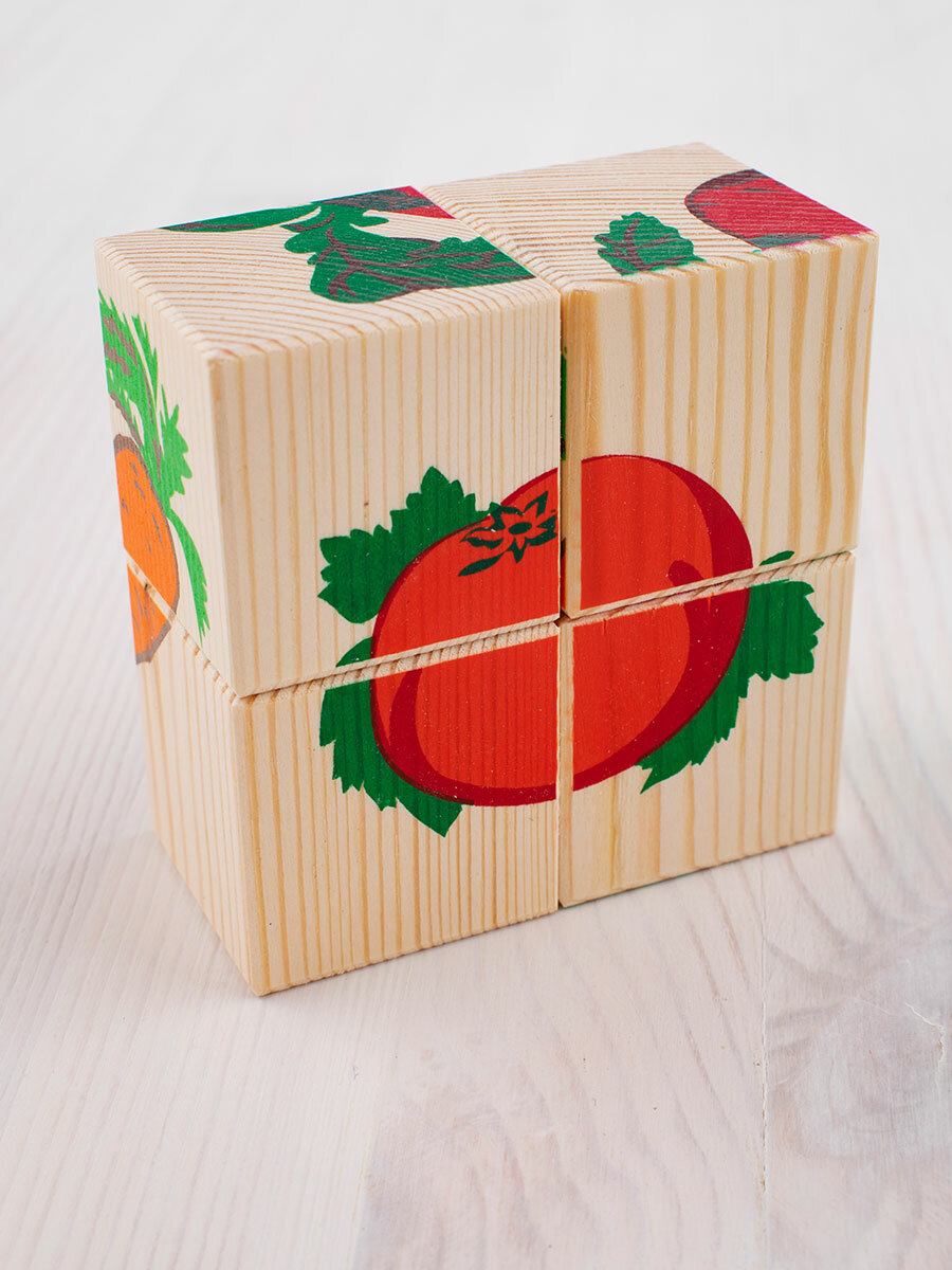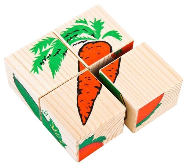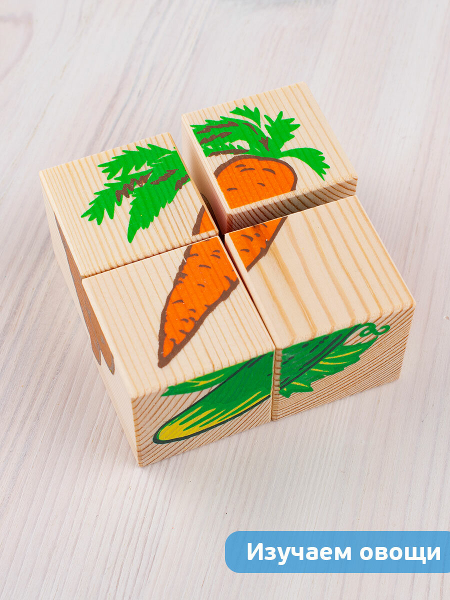 Кубики «Овощи» представляют собой набор из четырех кубиков. С их помощью можно собрать шесть изображений: спелый помидор, аппетитная морковка, зеленый огурец, картофель, капуста и свекла. Игра с кубиками развивает зрительное восприятие, наблюдательность и внимание, мелкую моторику рук и произвольные движения. Ребенок научится складывать целостный образ из частей, определять недостающие детали изображения. Рисунки нанесены методом шелкографии.