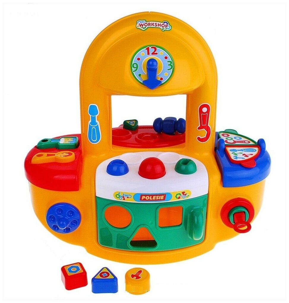 Какой мальчик не мечтает о собственной мастерской, в которой можно будет откручивать, отвинчивать и забивать все что угодно. Ведь так приятно почувствовать себя настоящим мастером, который может починить все что угодно. Конечно, для этого нужны не только умения, но и много инструментов. В Мастерской от белорусской компании Полесье их более чем достаточно: здесь есть и молоток, и отвертка, разводной ключ, кисточка. А ещё в Мастерскую можно играть с друзьями: к маленькому мастеру приходят «клиенты», которые сдают вещи на починку, а после того, как вещь отремонтирована, забирают ее в специальном месте для выдачи и расплачиваются в кассе за работу. Для маленького мастера предусмотрен специальный шкафчик, в котором можно хранить все инструменты, и множество деталей в самой мастерской, которые можно нажимать, крутить и забивать.