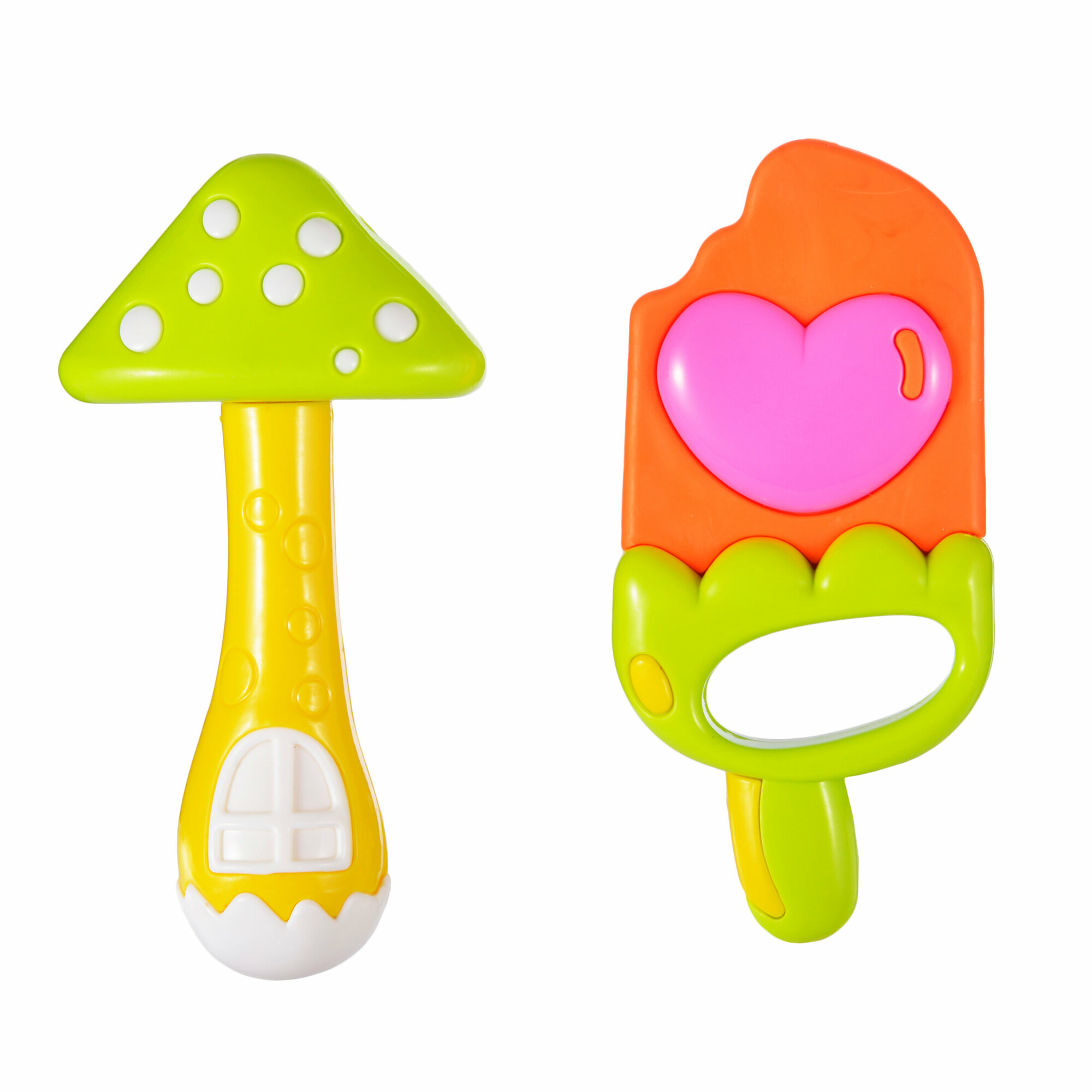 В наборе - яркая пара игрушек в виде мороженого и грибочка! Играя с погремушкой, ребенок развивает слух и тактильные ощущения. А прорезыватель просто необходим малышам, у которых появляются первые зубки. Игрушки помогают развить хватательный рефлекс и мелкую моторику рук.