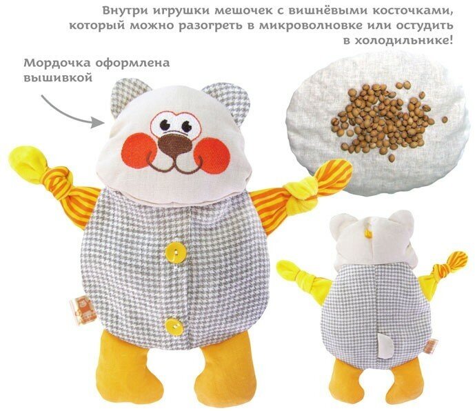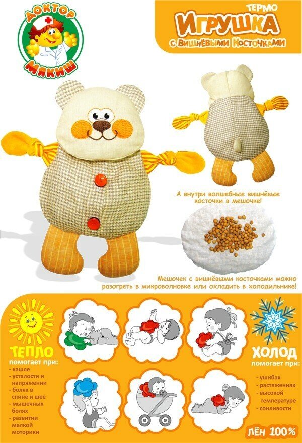 Игрушка Доктор Мякиш Мишутка с вишнёвыми косточками — это просто волшебство для Вас и Вашего малыша. А также настоящее спасение, благодаря вишнёвым косточкам! Льняную термоигрушку «Доктор Мякиш» можно использовать в трёх температурных режимах: горячий, холодный, нейтральный. Идеально подходит для зрительного, слухового, тактильного, эмоционального развития.