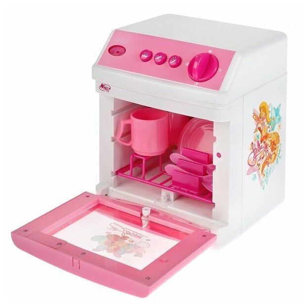 Посудомоечная машина Играем вместе Winx со светом и звуком оформлена в стилистике мультфильма "Клуб Винкс". Она может имитировать звук работы настоящего устройства и издавать сигнал окончания мойки посуды. При этом воспроизводятся световые эффекты. Для девочек от 3 лет.
