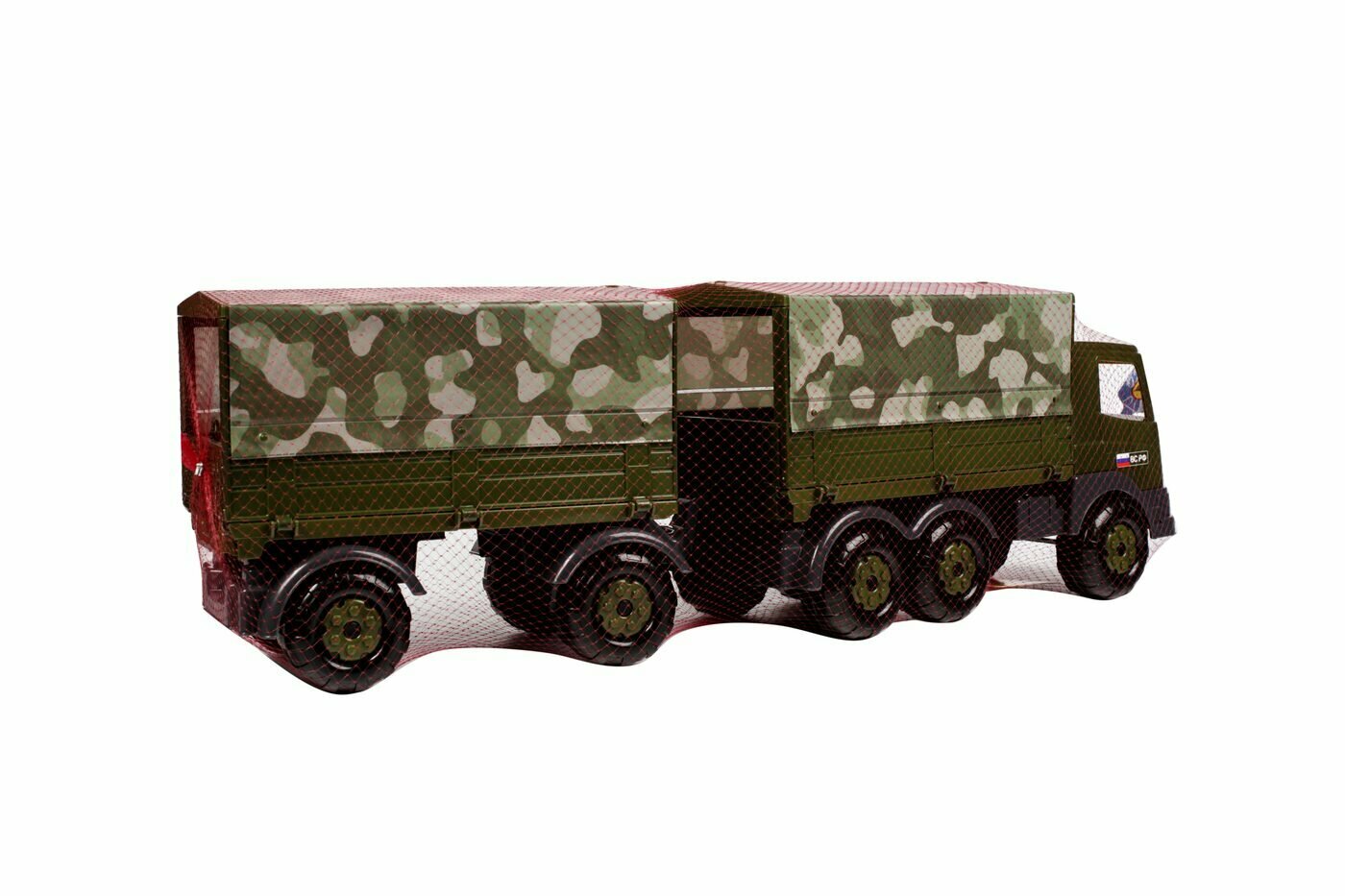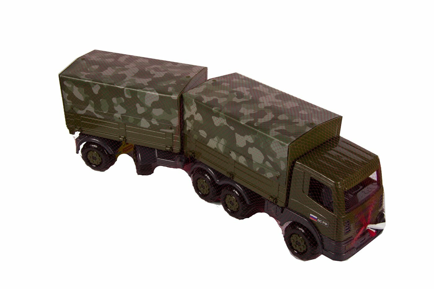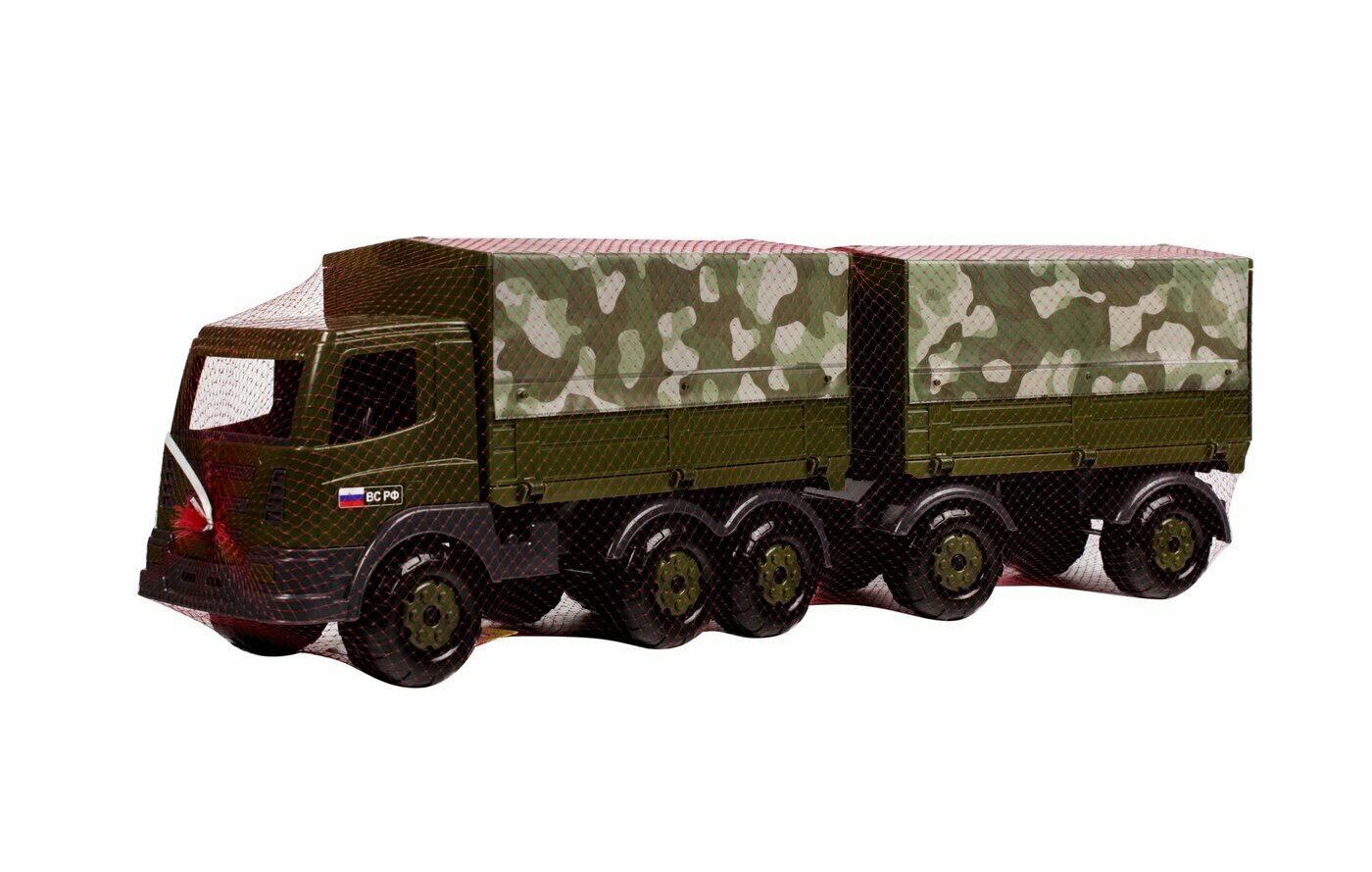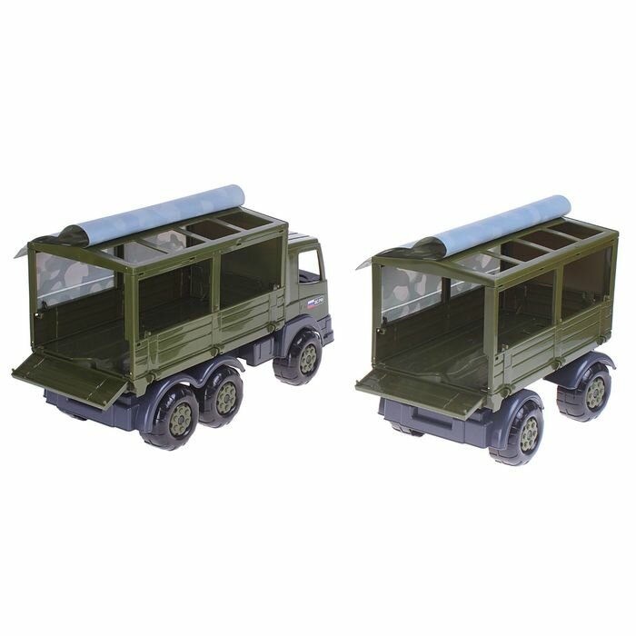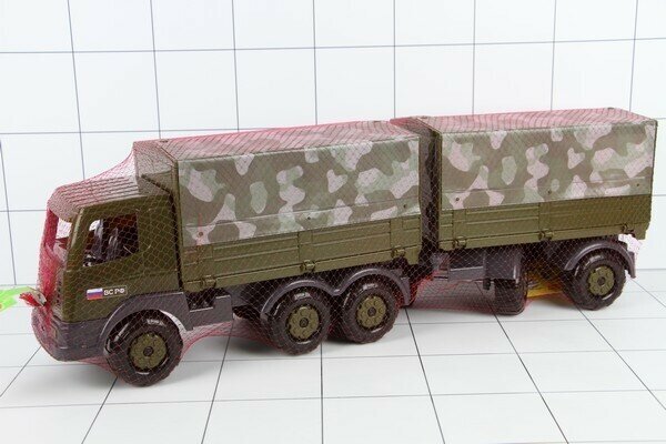 Военный бортовой тентовый автомобиль с прицепом из серии игрушек военной техники от бренда Полесье. Автомобиль выполнен в оригинальной военной расцветке. Прицеп крепится при помощи фаркопа, тент съемный. Автомобиль подходит для перевозки различных грузов, а так же игрушечных солдат. На переднем бампере предусмотрено отверстие для веревки. Теперь Ваш ребенок сможет водить автомобиль за собой на веревочке. С этой игрушкой можно играть как на улице, так и в доме.