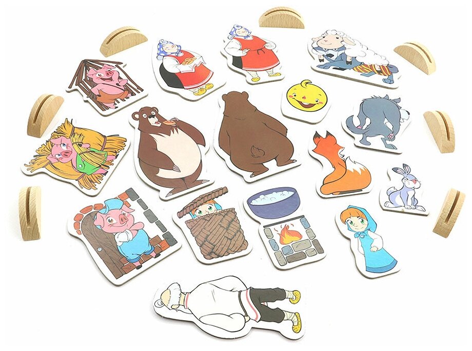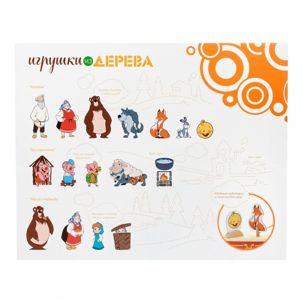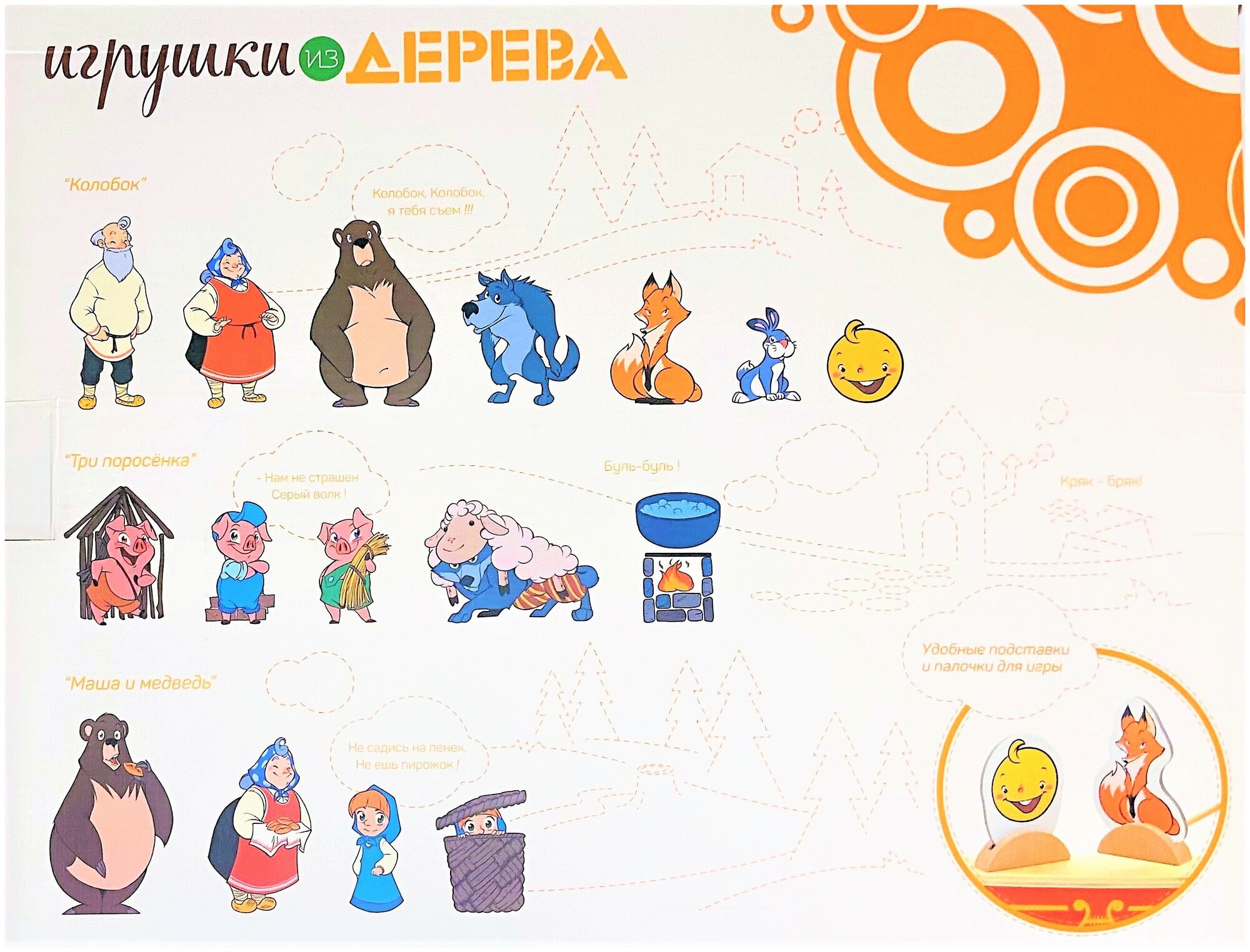 В комплект входит театральная сцена, три замечательные сказки "Маша и медведь", "Три поросенка", "Колобок, 16 персонажей, удобные подставки и палочки для игры. Меняй героев сказок и придумывай свои театральные постановки.