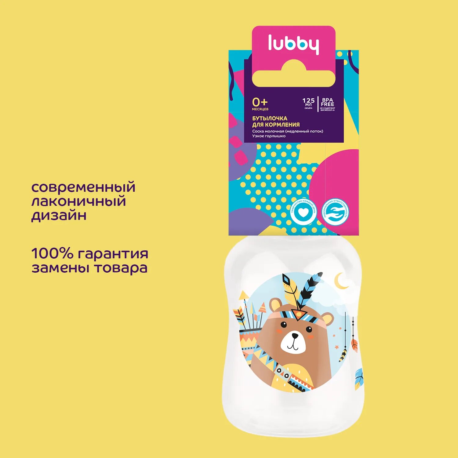 Бутылочка с соской Lubby Русские мотивы 125 мл порадует вас ярким и привлекательным дизайном. Она сделана из качественных материалов, которые безопасны для здоровья. Удобная для детских ручек форма не даст выскользнуть бутылочке. Красочный рисунок подарит отличное настроение.