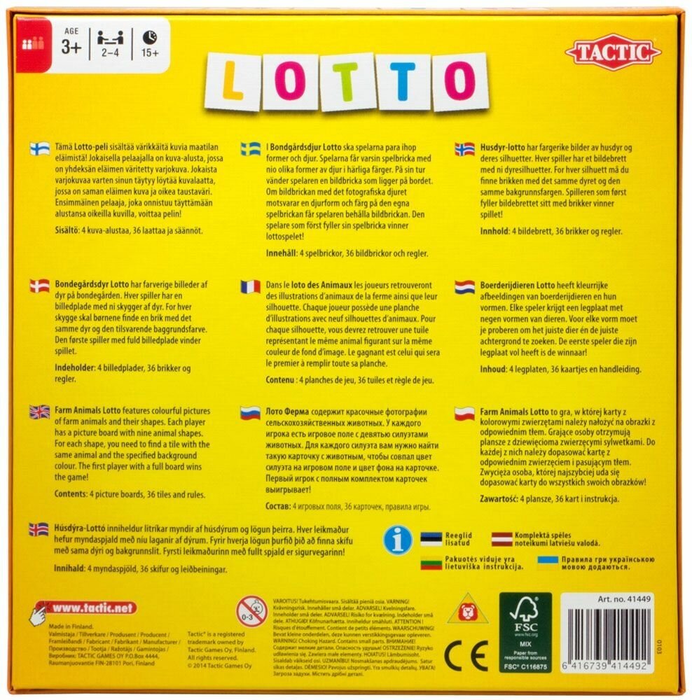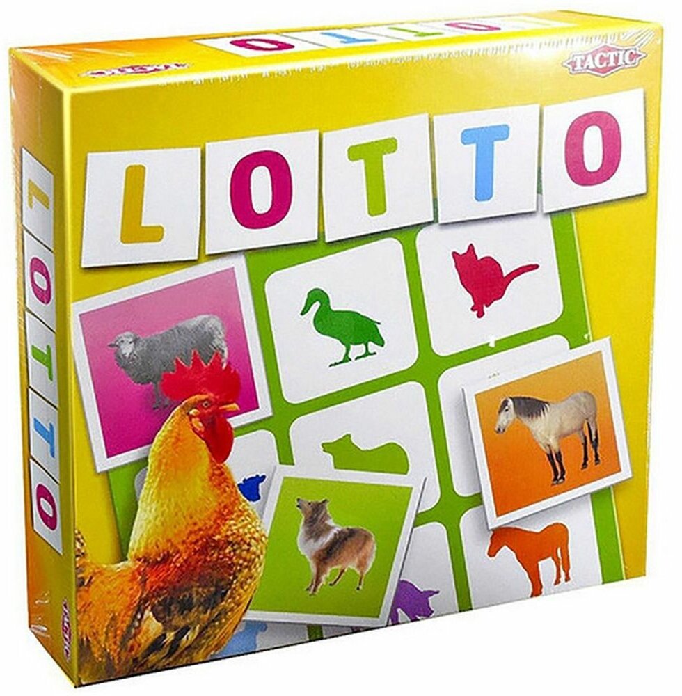 Настольная игра Lotto. Домашние животные - это обновленная версия полюбившейся родителям и детям игры от финского бренда Tactic. Правила остаются прежними - у каждого игрока есть свое поле 3х3, на котором нарисованы силуэты девяти животных. Между игроками выкладывается перемешанная стопка карточек, на которых изображены животные на цветном фоне. Поочередно карточки достаются из стопки. Кто первым опознал в карточке животное, изображенное на его поле, забирает ее. Цель игры - первым закрыть все силуэты животных на своем поле цветными карточками. Если вы играете вдвоем, можно усложнить правила и выдать каждому игроку не по одному, а по два поля.