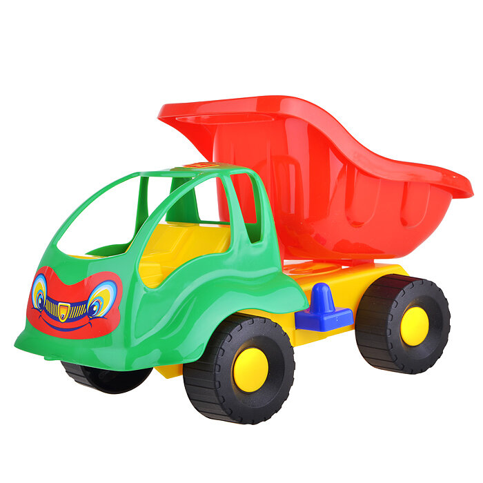 Cамосвал Муравей – очень удобная игрушка для прогулок на детской площадке. Муравей не большой и не маленький, так что легко поместится в пакет, а в песочнице в его кузов можно будет набрать достаточно много песка. Изготовленный из пластмассы, Муравей не боится ни езды по лужам, ни катания с горок. Кузов Муравья поднимается и опускается. Есть специальный замок, чтобы закрепить кузов в нижнем положении. На кабину самосвала наклеены веселые глазки и улыбающийся ротик.