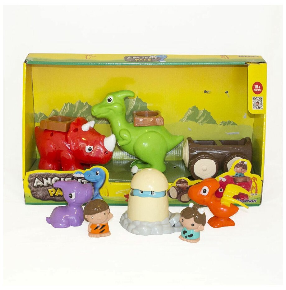 | Состав набора | фигурки динозавров - 4 шт; яйцо с невылупившимся детенышем; фигурки пещерных людей - 2 шт; доисторическая машинка. |