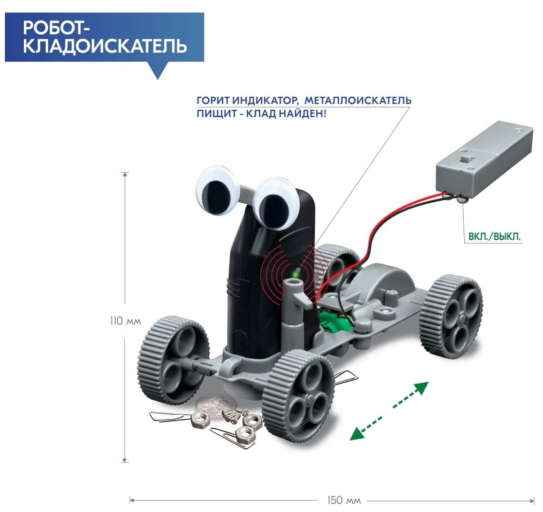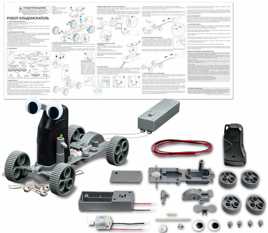 | Состав набора | 1 металлоискатель, 1 шасси с осью и шестерней, 1 мотор с проводами и червячным колесом, 1 крышка двигателя, основа для глаз и проволоки, 1 рычаг переключения, 1 шестерня, 2 оси (длинная и короткая), крышка аккумулятора, 4 колеса, 4 наконечника, винты, соединительный кабель, пульт дистанционного управления, подробная инструкция на русском языке |