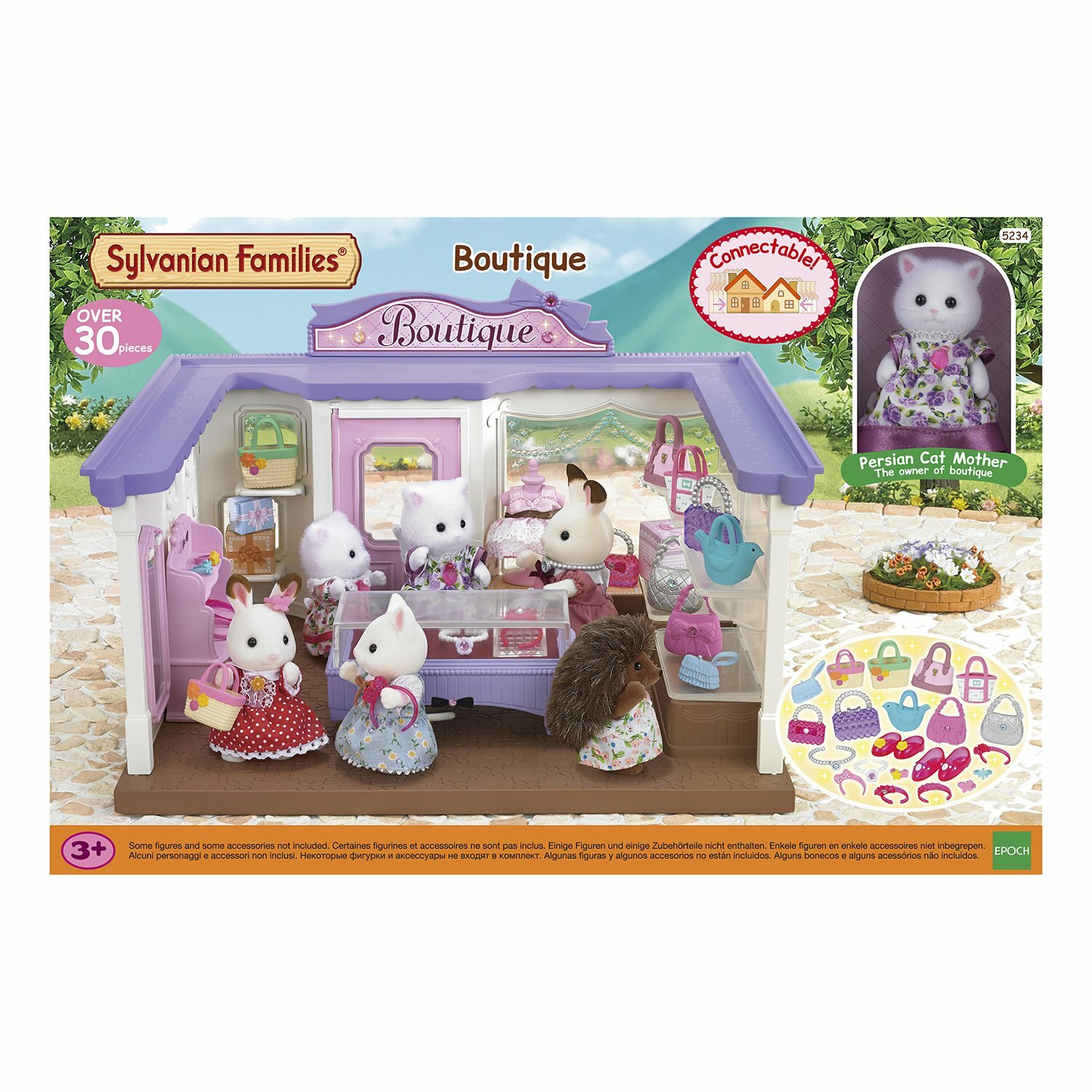 Sylvanian Families Набор Модный бутик 5234 Детский игровой набор Sylvanian Families Модный бутик позволяет создать на торговой улице городка Сильвания магазинчик с большим выбором дамских сумочек, обуви, украшений и аксессуаров. Здание магазина оборудовано витринами, есть зеркало, диван, манекен и множество товаров для продажи. В комплекте фигурка персидской кошки высотой 9,5 см. Фигурка одета в платье с белым кружевом. Голова и лапки фигурки двигаются.