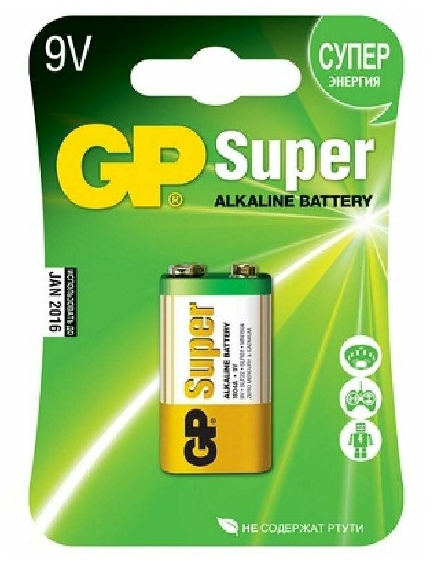 Элемент питания GP 1604A(6FL22)-BC1 изготовлен в стальном прямоугольном корпусе. Изделие имеет номинальное напряжение 9 В. Устройство обеспечивает продолжительную работу разнообразных электрических устройств. Элемент питания не подлежит повторному использованию и зарядке. Применяйте в детских игрушках только качественные батарейки.