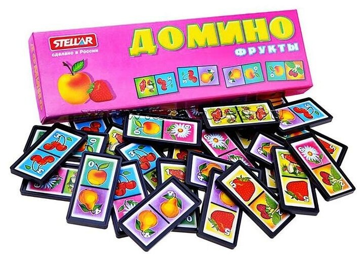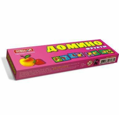 Домино Stellar Фрукты позволит вам и вашему малышу весело и с пользой провести время. Комплект игры включает в себя 28 фишек с красочными изображениями фруктов. Фишки выполнены из безопасного полистирола. Каждый игрок должен добавить в цепочку из фишек одну их своих фишек так, чтобы изображение на ней подошло к изображению на конце цепи. Если в руках у игрока нет подходящей фишки, он берет дополнительные до тех пор, пока не попадется нужная. Выигрывает тот, кто первым выложит все свои фишки. Также красочные фишки можно использовать в качестве обучающего материала - на примере картинок вы сможете рассказать малышу о фруктах. Игра в домино не только подарит малышу множество веселых мгновений, но и поможет познакомиться с новыми словами, а также развить внимательность, пространственное мышление и мелкую моторику.