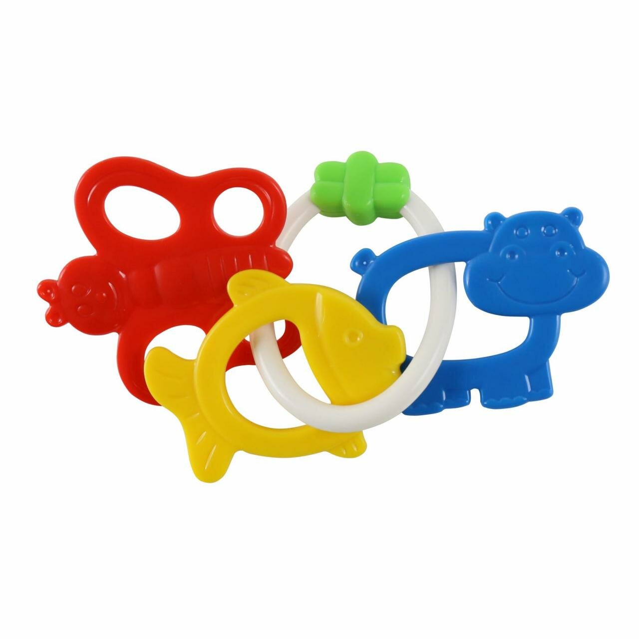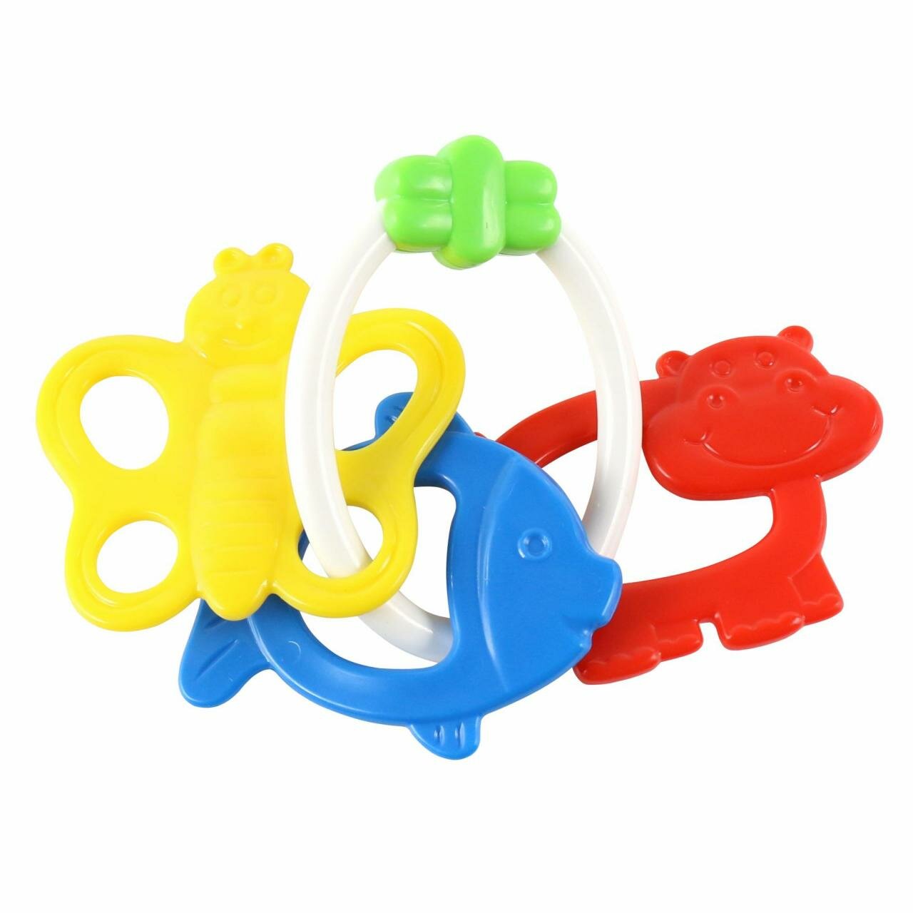 Погремушка Кольцо яркая приятная расцветка сразу же привлекает внимание, а особое наполнение позволяет звучащему элементу издавать приятные звуки. Ее можно использовать как прорезыватель благодаря пластиковым элементам в виде забавных рыбки, бабочки и бегемотика. Погремушка приятна на ощупь, окрашена пищевыми красителями и сделана из абсолютно безопасного пластика. Ваш ребенок может манипулировать ею как пожелает, оставаясь в полной безопасности. Игрушка отвечает строгим требованиям стандартов качества и экологической безопасности. Она будет лучшим подспорьем в раннем развитии любого ребенка.