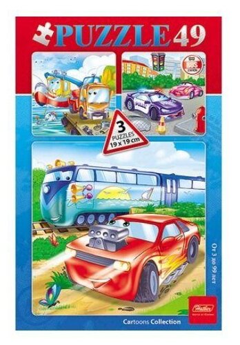 Пазл 3 в 1 "Тачки", представленный торговой маркой Hatber, предназначен специально для детей, так как в наборе есть три головоломки с небольшим количеством элементов. На собранных изображениях можно увидеть "живые" машинки, а также другой транспорт. Элементы пазлов изготовлены из качественного картона.