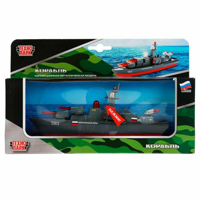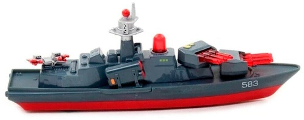 Корабль - мини-копия настоящего. Красно-серая расцветка сближает сооружение с военным. Все детали корабля проработаны до идеала. Данная модель является коллекционной, она - отличный вариант для подарка тому, кто неравнодушен к военной технике. Если нажать на кнопку корабля, он начнет демонстрировать световые и звуковые эффекты, словно настоящий! Игрушка имеет инерционный механизм движения: если ее толкнуть вперед, она преодолеет солидное расстояние.