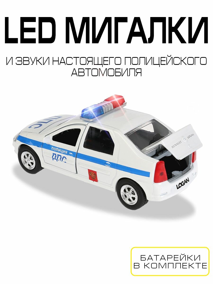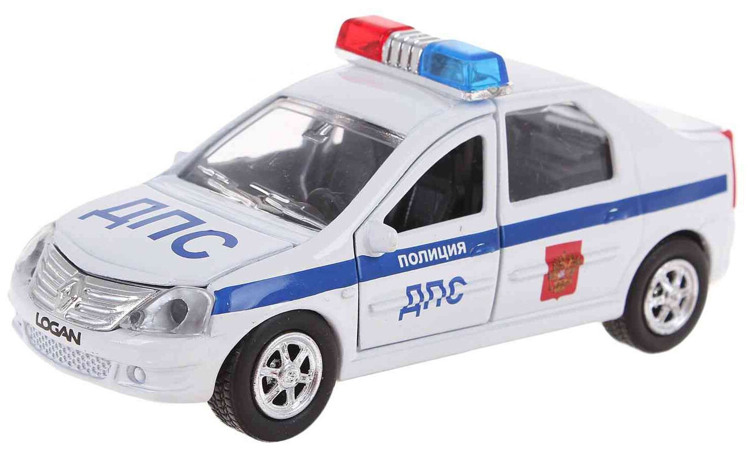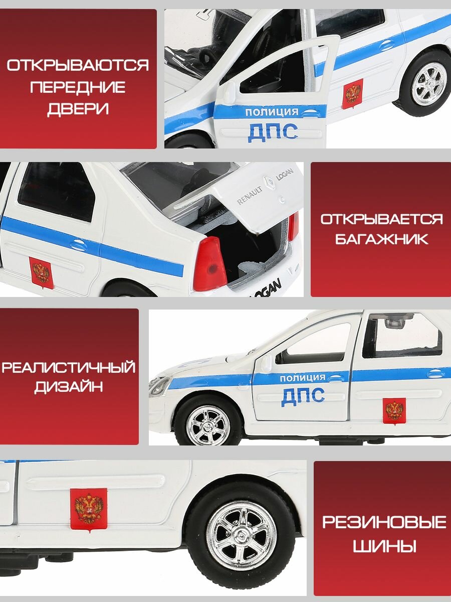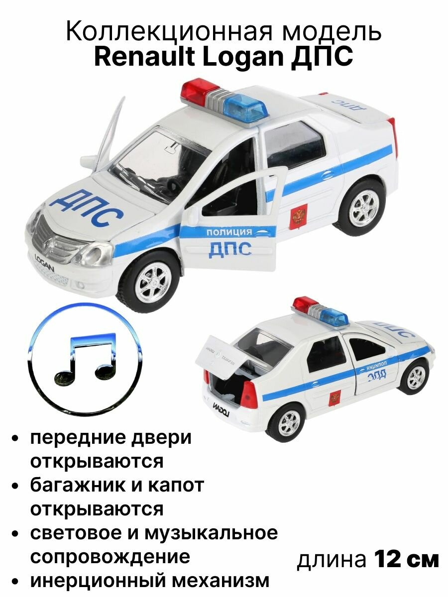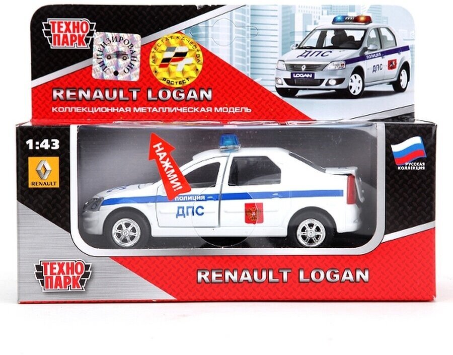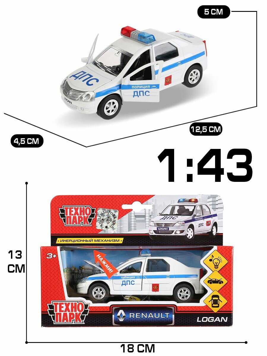 Renault Logan ДПС — это инерционная игрушечная машинка, которая сама помчится вперед, если ее потянуть чуть назад, а затем отпустить. Отличительные черты данной модели — открывающиеся капот, багажник и двери. Благодаря этому, всегда можно будет заглянуть машинке внутрь, чтобы убедиться — каждая ее деталь проработана «на отлично». Помимо всего прочего, игрушка поддерживает световые и звуковые эффекты, имитируя сирену настоящей полицейской машины.