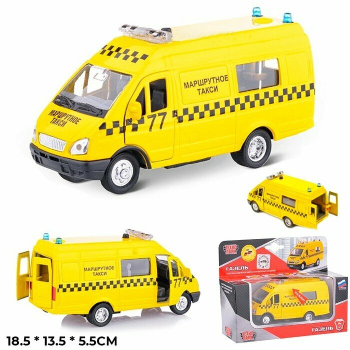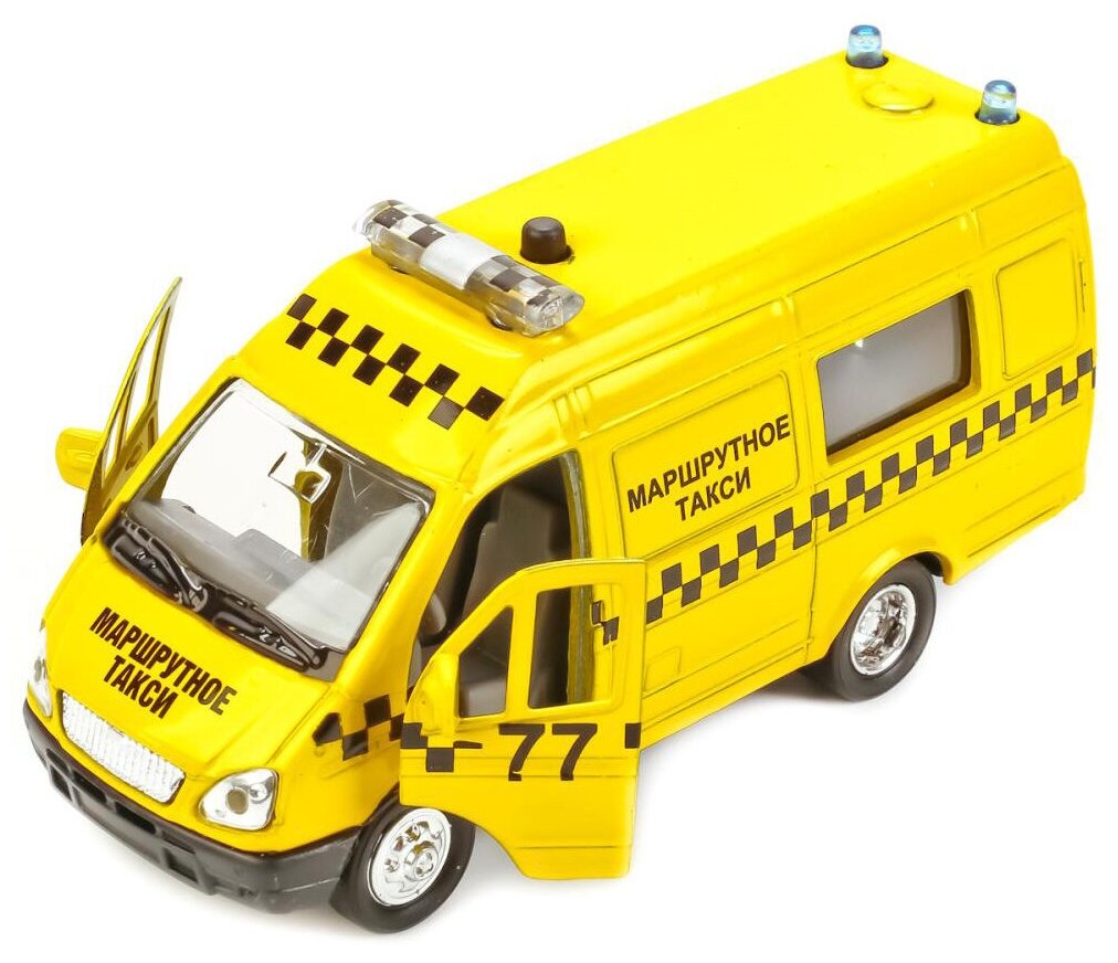 Инерционная машинка Газель: Маршрутное такси, выполненная из пластика и металла, станет любимой игрушкой вашего малыша. Игрушка представляет собой модель автомобиля такси марки Газель. У машинки открываются передние, задние и боковая дверцы. При нажатии на кнопку на крыше модели замигают проблесковые маячки и раздастся голос водителя. Игрушка оснащена инерционным ходом. Машинку необходимо отвести назад, затем отпустить - и она быстро поедет вперед. Прорезиненные колеса обеспечивают надежное сцепление с любой гладкой поверхностью. Ваш ребенок будет часами играть с этой машинкой, придумывая различные истории. Порадуйте его таким замечательным подарком!