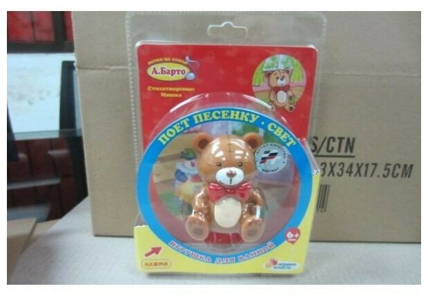 Данная игрушка от компании "Играем вместе" выполнена в виде коричневого медвежонка, который сможет составить компанию малышу во время купания. Игрушечный медведь может воспроизвести песенку А. Барто, под которую можно потанцевать. Также интерактивная игрушка имеет световые эффекты, благодаря которым пластмассовый мишка становится ярче, заметнее.