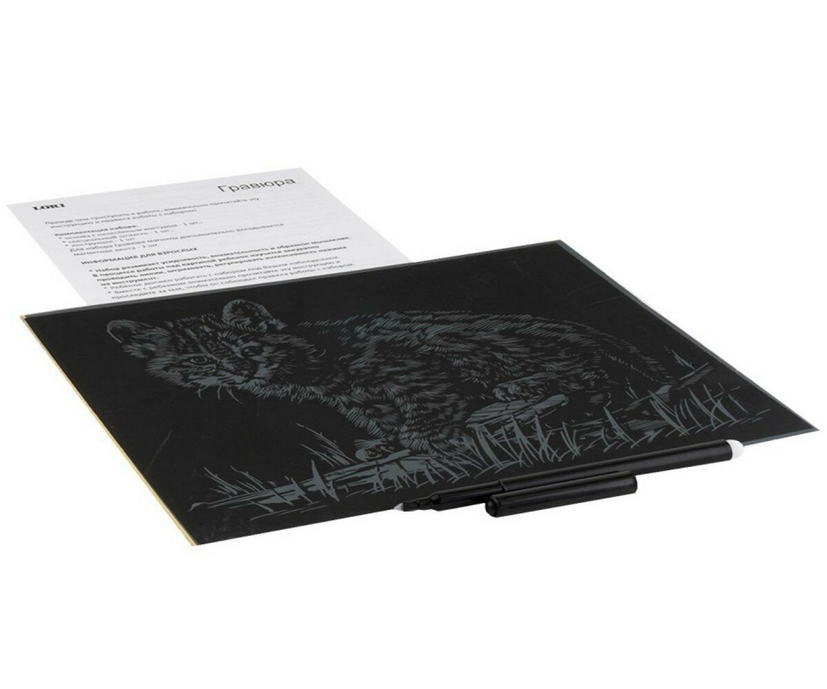 Когда дети становятся старше, им требуются более сложные наборы для творчества. Например, если вы не боитесь давать малышу в руки предметы острее пластмассового ножа, тогда вам для творческих занятий прекрасно подойдет товар от компании Lori – гравюра из серии Little Animals Рысенок. С помощью ножичка здесь нужно прорисовать изображение на темном фоне.