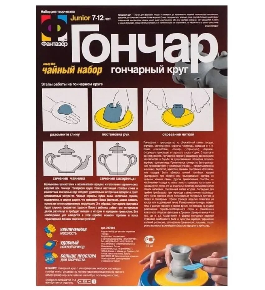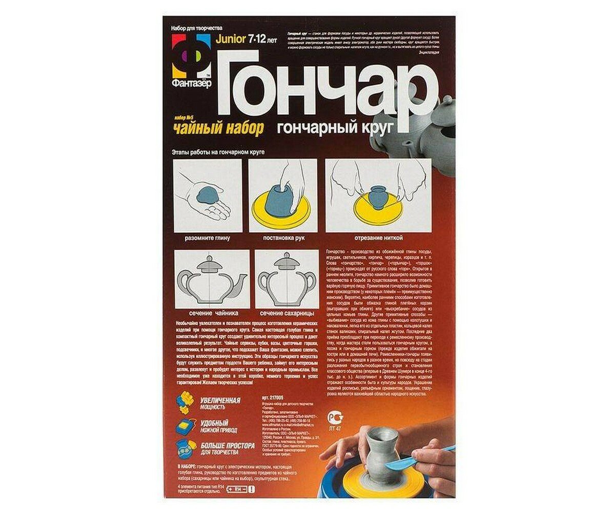 | Состав набора | гончарный круг с электрическим мотором, настоящая голубая глина, скульптурный стек, руководство по изготовлению предметов из чайного набора (сахарницы или чайника на выбор) |