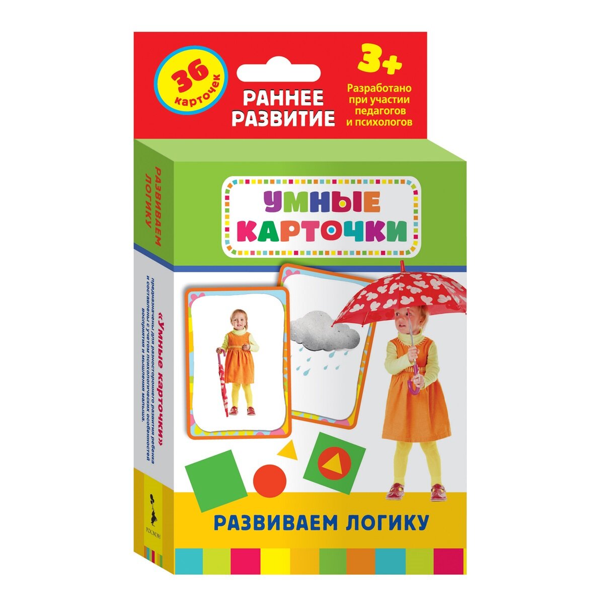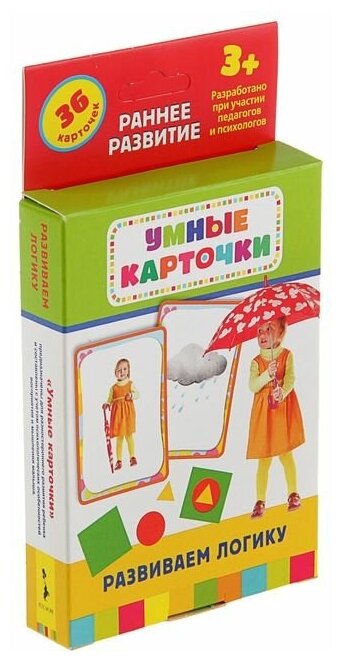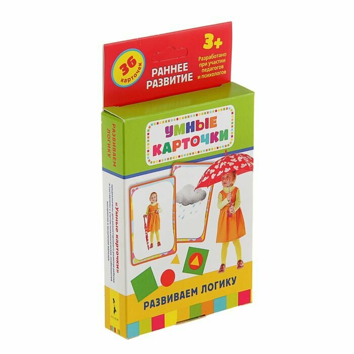 Раннее развитие. Умные карточки "Развиваем логику " (с 3 лет) РосмэнУмные карточки "Развиваем логику " от фирмы "Росмэн" разработаны совместно с педагогами и психологами специально для детей от 3-х лет. Набор из 36 карточек с красочными изображениями, интересными заданиями и развивающими логику играми поможет интересно и с пользой провести свое время с ребенком.