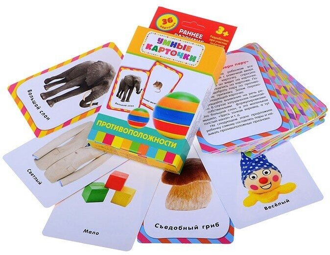 Комплект Умные карточки для детей от трех лет - набор из 36 карточек с красочными фотографиями, понятными, интересными заданиями, занимательными играми и методическими рекомендациями.