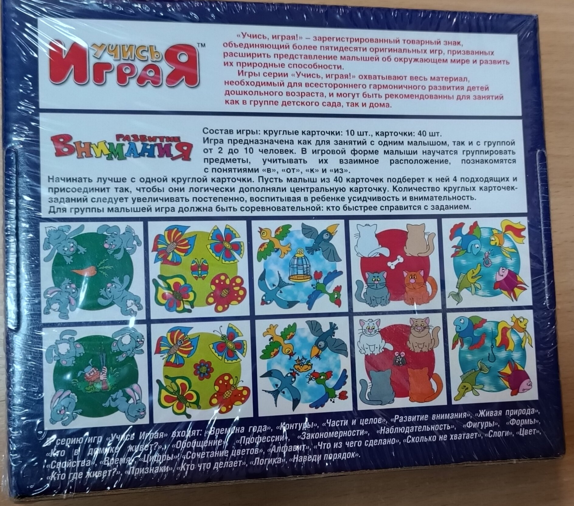 Развивающая игра выполнена в виде дидактического материала и предназначена для развития внимания, памяти и ориентации в пространстве. В игровой форме дети учатся обобщать, запоминают предлоги, развивают логику. В комплекте 10 блоков, в каждом по 5 маленьких карточек, связанных центральным изображением. Детали в группе соединяются между собой по принципу пазла. Карточки дополнительно можно использовать как лото.