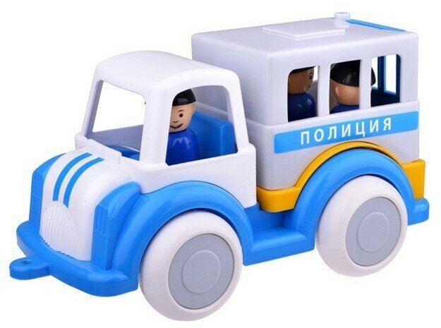 С интересной и оригинальной полицейской машинкой малыш не будет скучать. Игрушка довольно легкая, впереди есть отверстие для того, чтобы вдеть туда веревку и катать машинку вслед за собой. Задняя дверца открывается. Материал, из которого изготовлена эта игрушка, — высококачественный пластик, машинку можно эксплуатировать на улице. Массивные колеса автомобиля изготовлены из резины. В игрушке находятся человечки, которых можно вытаскивать через заднюю дверь. Они наверняка привлекут внимание малыша и станут героями его игр.