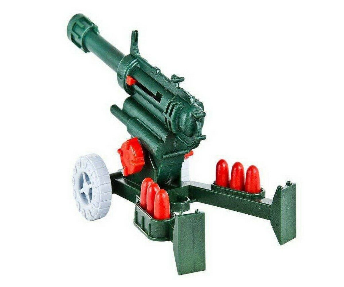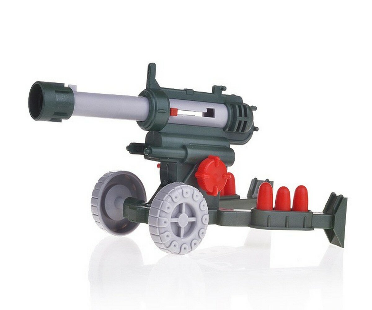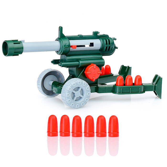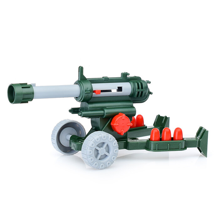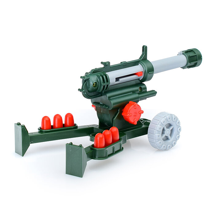Игрушечная пневматическая пушка интересна не только тем, что она похожа на настоящее военное орудие, но и тем, что она действительно способна выстреливать снарядами. И пушка, и снаряды созданы из качественного и легкого пластика, так что игрушка безопасна в применении. Ствол орудия может подниматься и поворачиваться, так что при желании можно стрелять по задуманным целям.