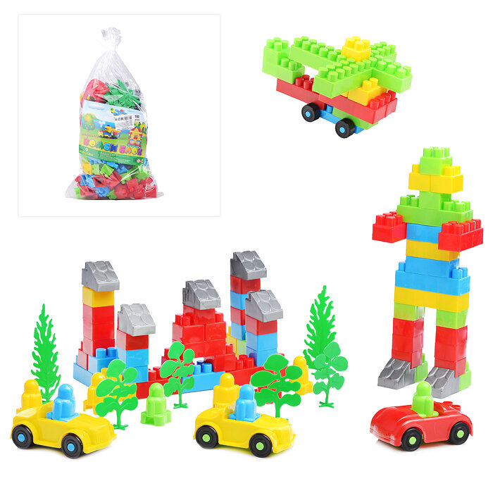 Пластмассовый блочный конструктор (150 деталей). Состоит из разноцветных деталей разной длины. Игра способствует развитию мелкой моторики и координации движений обеих рук, образного и пространственного мышления, воображения.